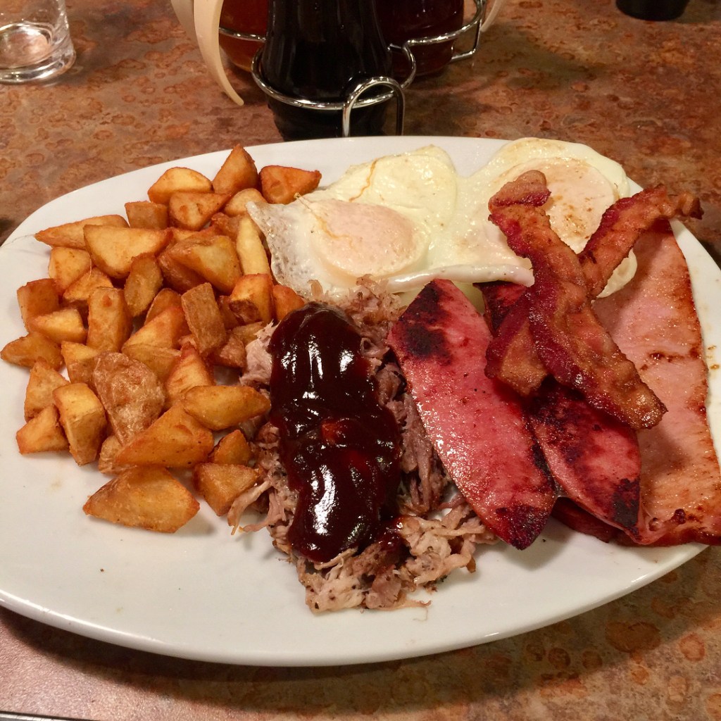 Que tal jantar o café da manhã no Perkins Family Restaurant? Nota 10/10 #ExperimentaIsso #USA #EUA #perkins #breakfast #bacon #eggs #potato #pork #barbecue #ham #sausage #pancakes #butter #jam #syrup #batata #costelinha #salsicha #presunto #ovo #panqueca #manteiga #jamon #foodporn #instafood #foodporn