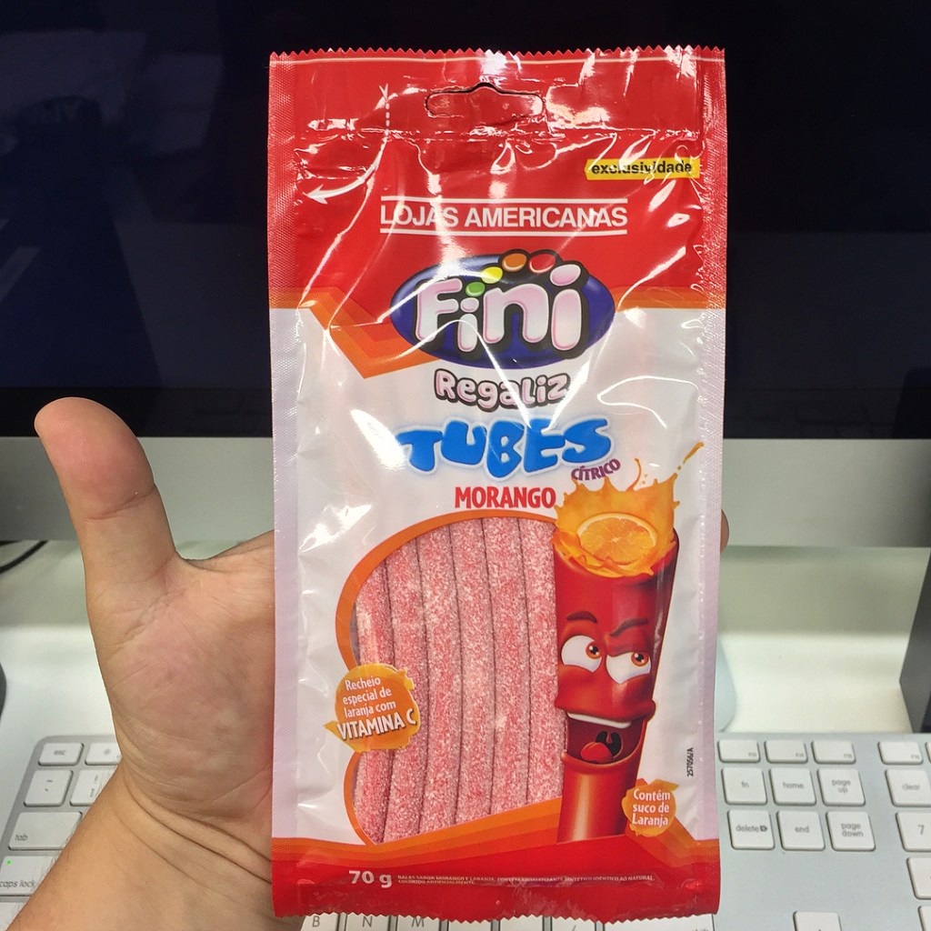 🇧🇷Regaliz Tubes Cítricos com Recheio de Laranja!Mais uma exclusividade das Lojas Americanas! Nota: 7/10 Atualização: agora não é mais exclusivo, pode ser encontrado no site da Fini e no varejo em geral! #ExperimentaIsso #fini #mundofini #regaliz #lojasamericanas #morango #balasdegelatina