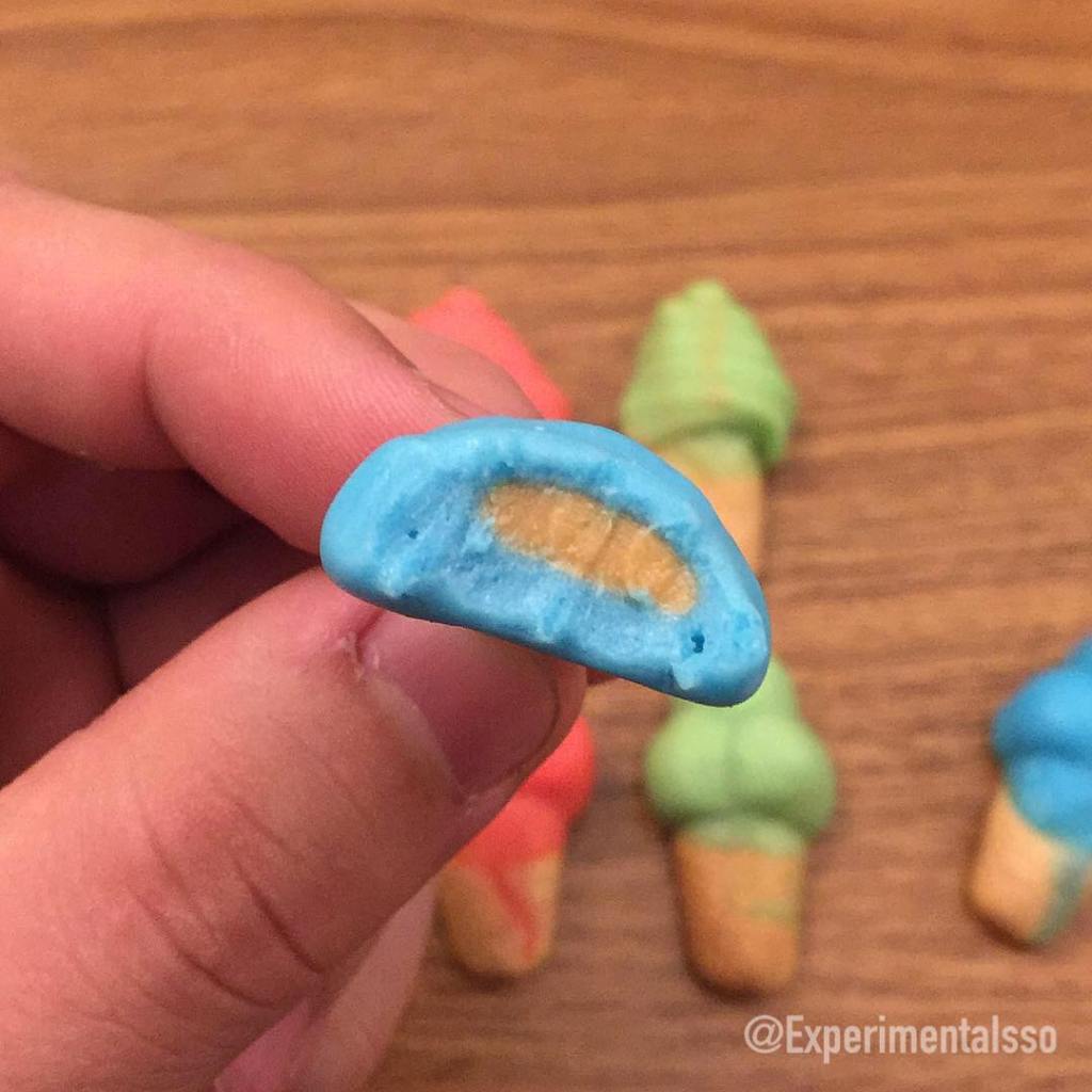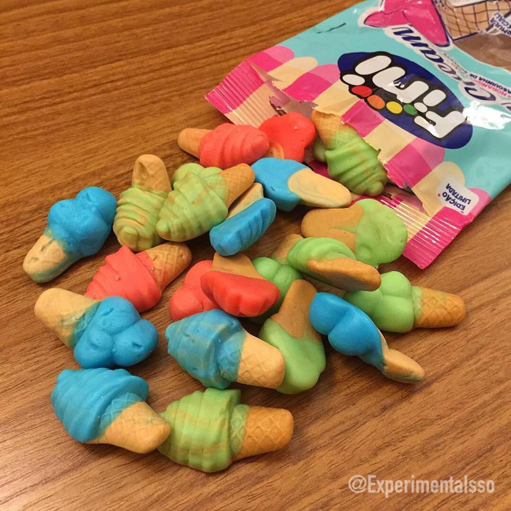 A parte da “massa” causa uma sensação de refrescância e a parte da “casquinha” tem uma fórmula pra parecer mais durinha! É bem divertida! 😆 São três cores representando os sabores morango, limão e céu azul! 🤷♂️ Nota: 7/10!