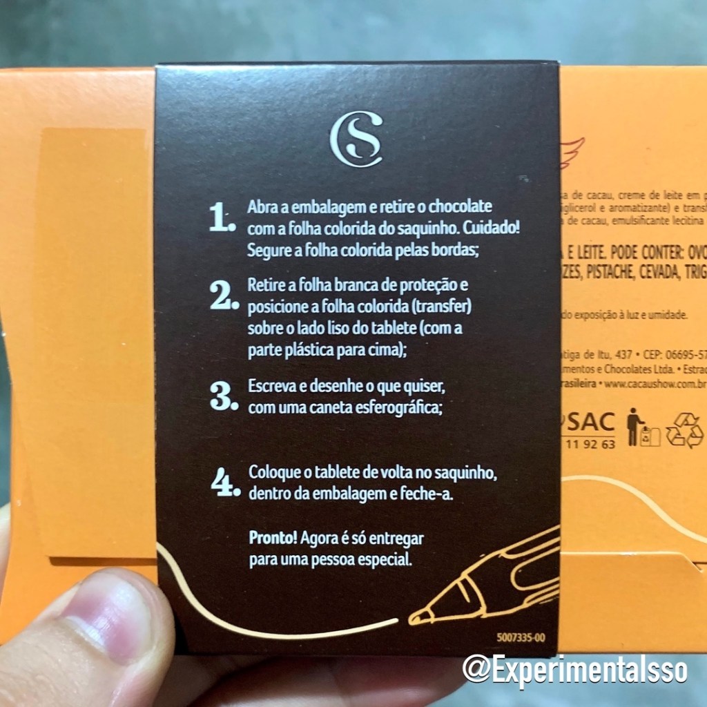 Esse é mais um produto inovador que a Cacau Show irá lançar em breve! É uma barra de chocolate pra você escrever! A barra de chocolate parece ser uma simples (e deliciosa) barra de chocolate ao leite! O que faz a mágica mesmo é a pequena folha amarela que vem junto e funciona quase como um carbono comestível! Você coloca essa folha em cima da parte lisa do chocolate e pode escrever e desenhar o que quiser em cima dela! É só usar uma caneta esferográfica. Depois de personalizado, você pode colocar o chocolate na embalagem fornecida e presentear quem você quiser! 😁⠀ .⠀ Nota: 9/10 Lançamento em breve! .⠀ #chocolate#crianca#novidades