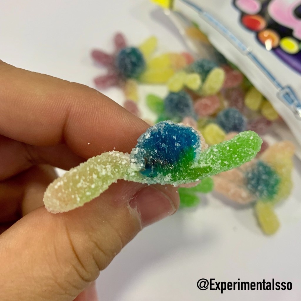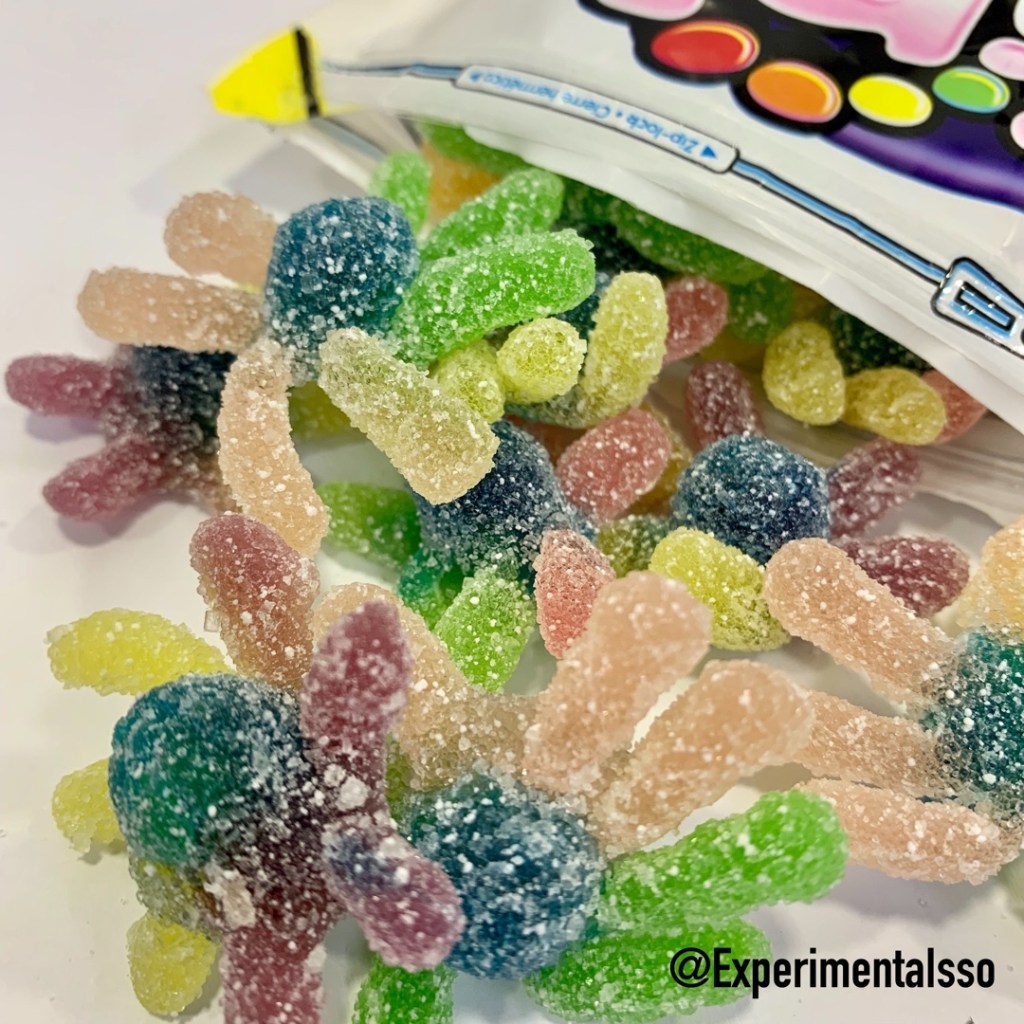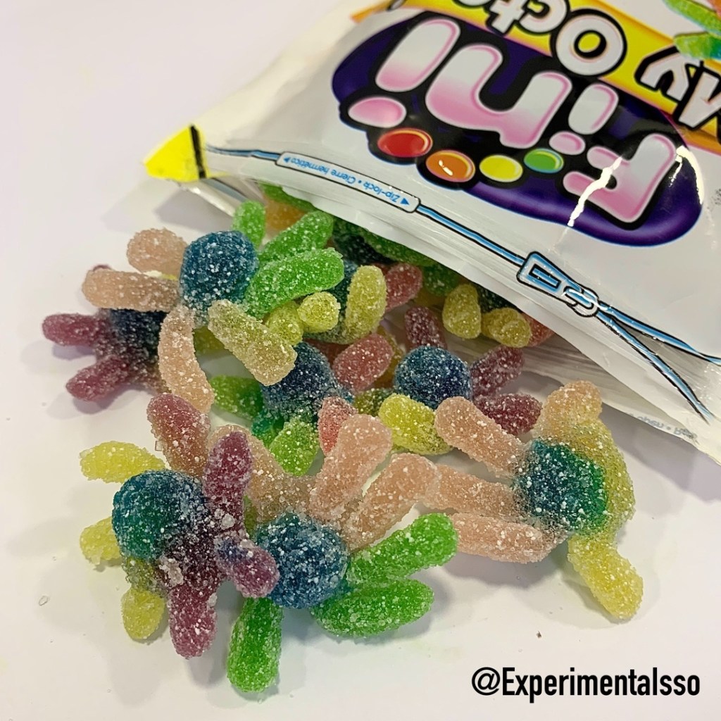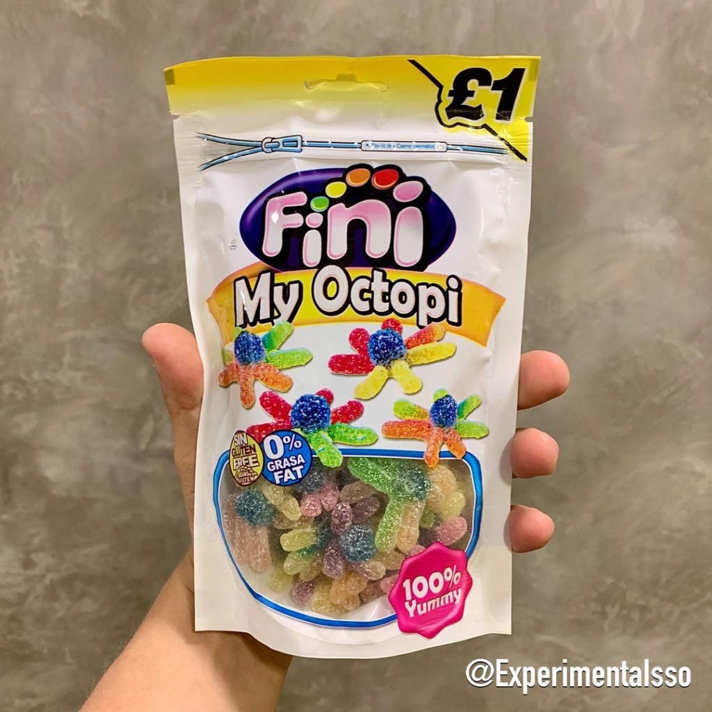 Encontramos esse pacotão de FINI em Londres. A parte mais legal são as balas que tem formato de “polvinhos”! 😄 As balas tem sabores de frutas e uma textura um pouco diferente das balas de gelatina mais tradicionais, como se tivesse um pouco de açúcar cristalizado misturado na bala. Não chega a parecer “bala de goma”, mas lembra um pouco por causa desse açúcar dentro e fora da bala!