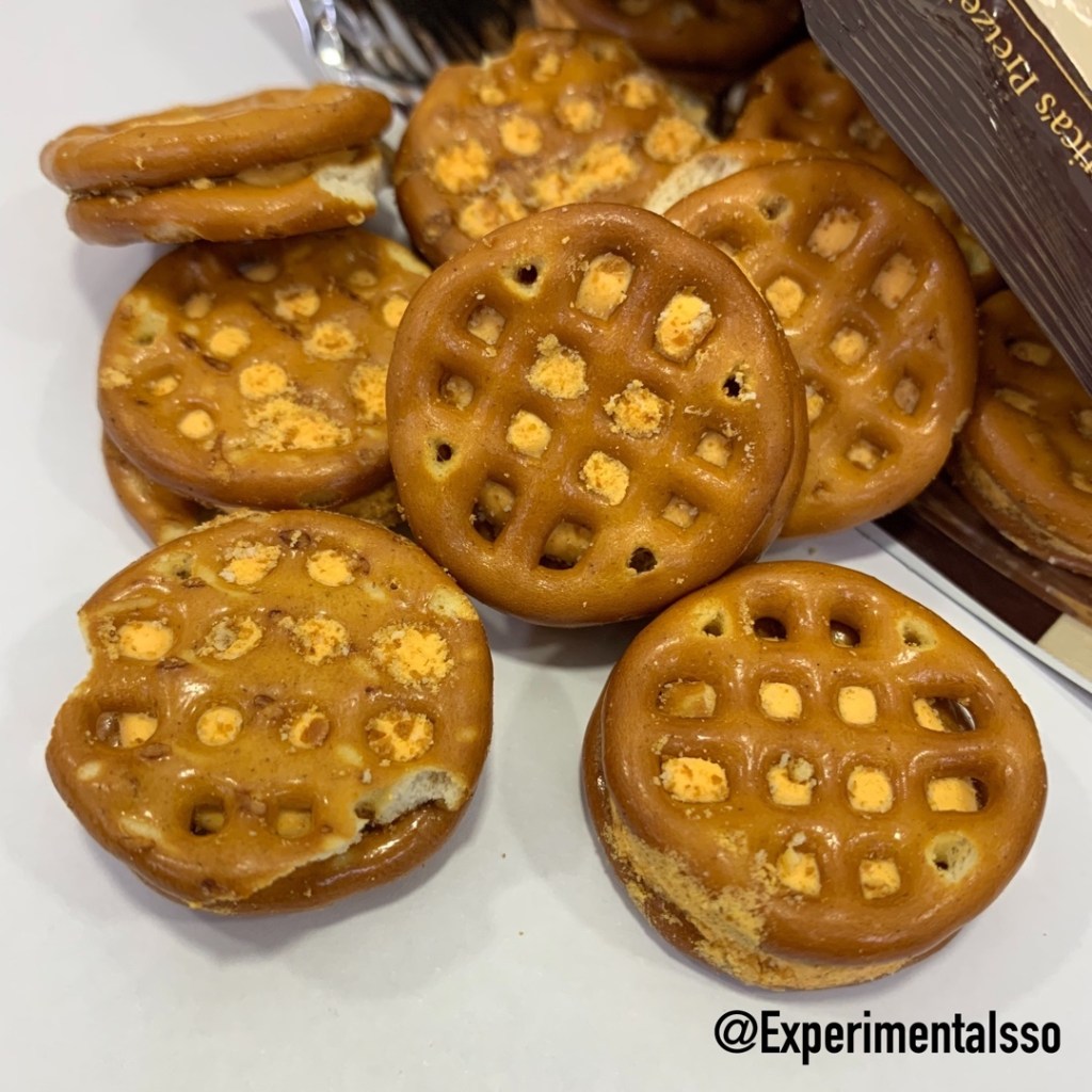 🇺🇸🇧🇷Mini Sanduíche de Pretzel😋 Quem gosta de pretzels salgados, vai achar bem interessante isso aqui. São 2 pequenos pretzels redondinhos recheados com um creminho salgado sabor cheddar! Nós experimentamos uma vez nos EUA mas encontramos ele em promoção aqui no Emporium São Paulo. Quem conhece essa marca já deve saber que os produtos são bem gostosos e crocantes. O recheio salgado lembra um pouco o recheio do Club Social Recheado e outros snacks salgados desse tipo, que já passaram pelos nossos mercados. É uma boa alternativa pra quem estiver querendo dar uma variada no clássico biscoito de água e sal. 😉⠀
