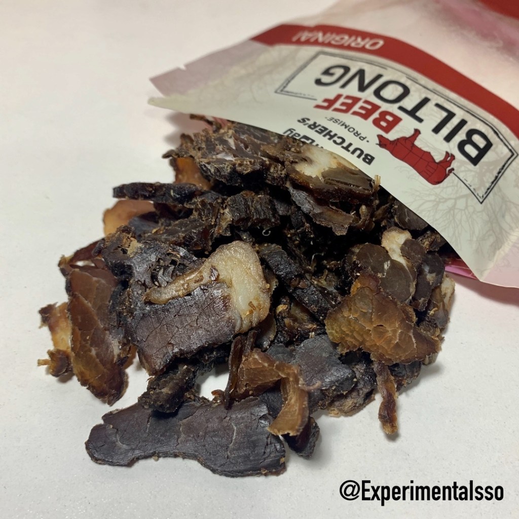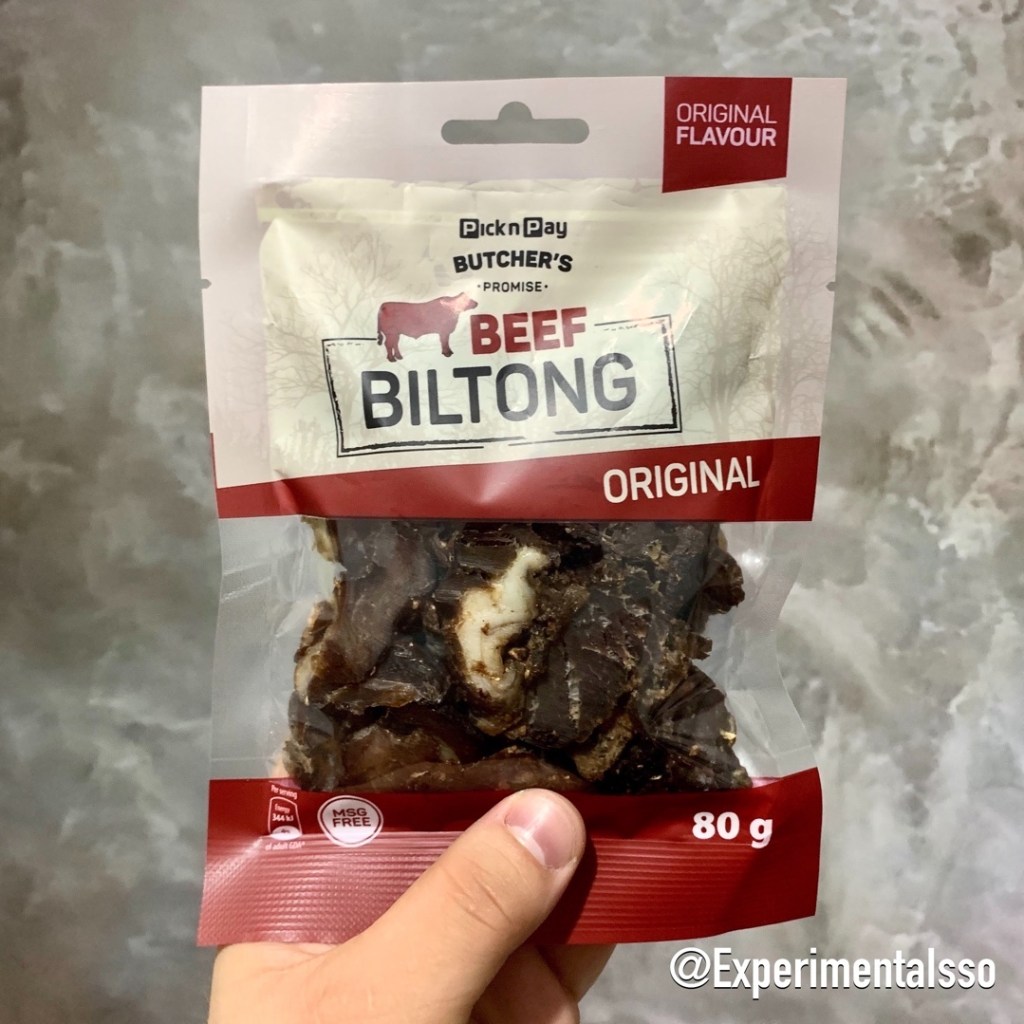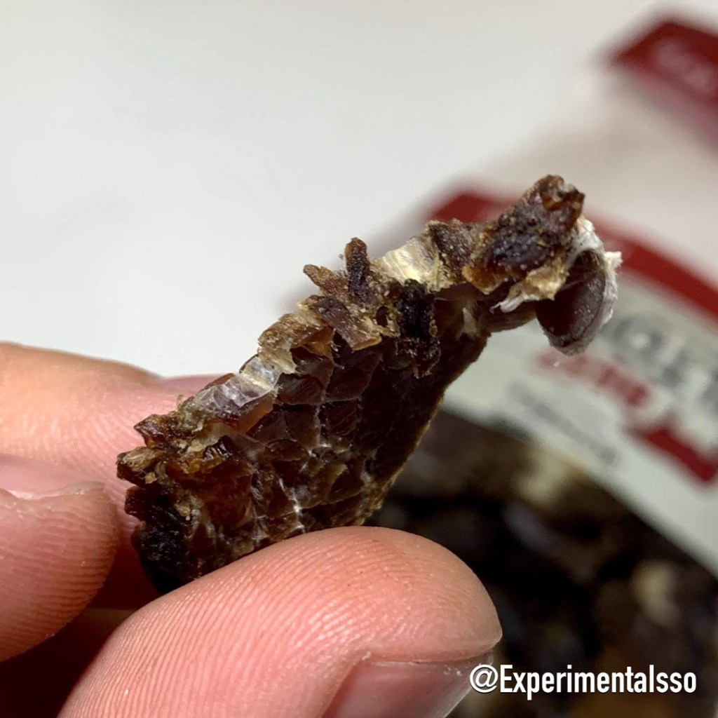 Já experimentamos algumas marcas de carne seca pelo mundo, mas essa aqui realmente era bem diferente! Só pelas fotos já da pra notar isso. Parece que pegaram um assado do churrasco e simplesmente fatiaram bem fininho e colocaram no pacotinho! 😅 O sabor também lembra um pouco um “churrasco” brasileiro, mas o fato de ter essas gordurinhas no meio nos incomodou um pouco. Mas o sabor ainda assim era bem gostoso! 😋