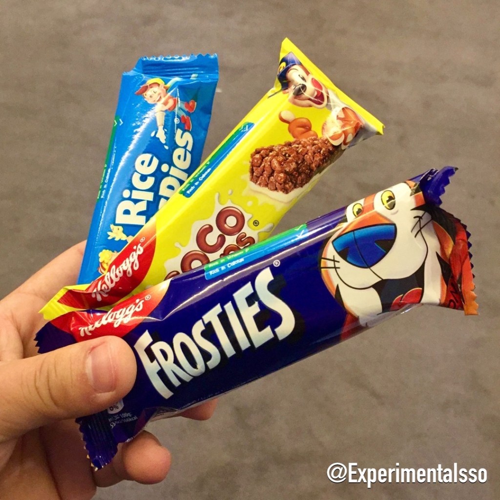 Semana passada mostramos os cereais matinais que experimentamos no café da manhã em Dubai e ontem mostramos as barrinhas de cereais da Nestlé! Essas aqui são as barrinhas de cereais da Kellogg’s! A primeira barrinha é feita com Frosties que é a versão internacional do nosso “Sucrilhos”. Ela é bem parecida com a barrinha que temos aqui no Brasil, mas ao invés de ter chocolate ao leite na parte de baixo, essa barrinha tem chocolate branco. A segunda barrinha é feita com o cereal Coco Pops que mostramos no post da semana passada, aquele que é tipo o “Choco Krispis” que tínhamos no Brasil. Além do cereal, essa barrinha também tem a parte de baixo banhada em chocolate branco. A última barrinha é feita com o cereal Rice Krispies, que não chegamos a experimentar, mas é basicamente um cereal de flocos de arroz caramelizados, e de novo, essa barrinha tem o chocolate branco embaixo!⠀