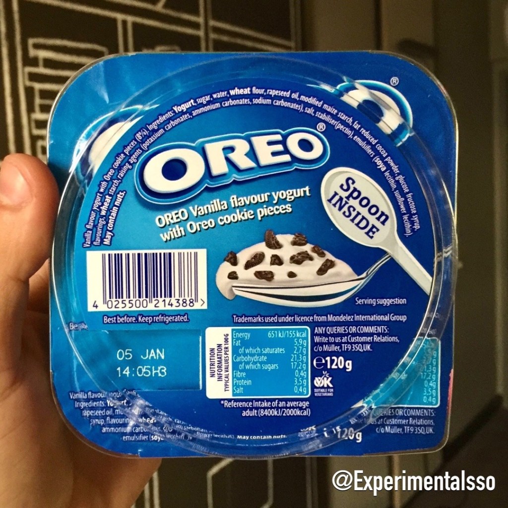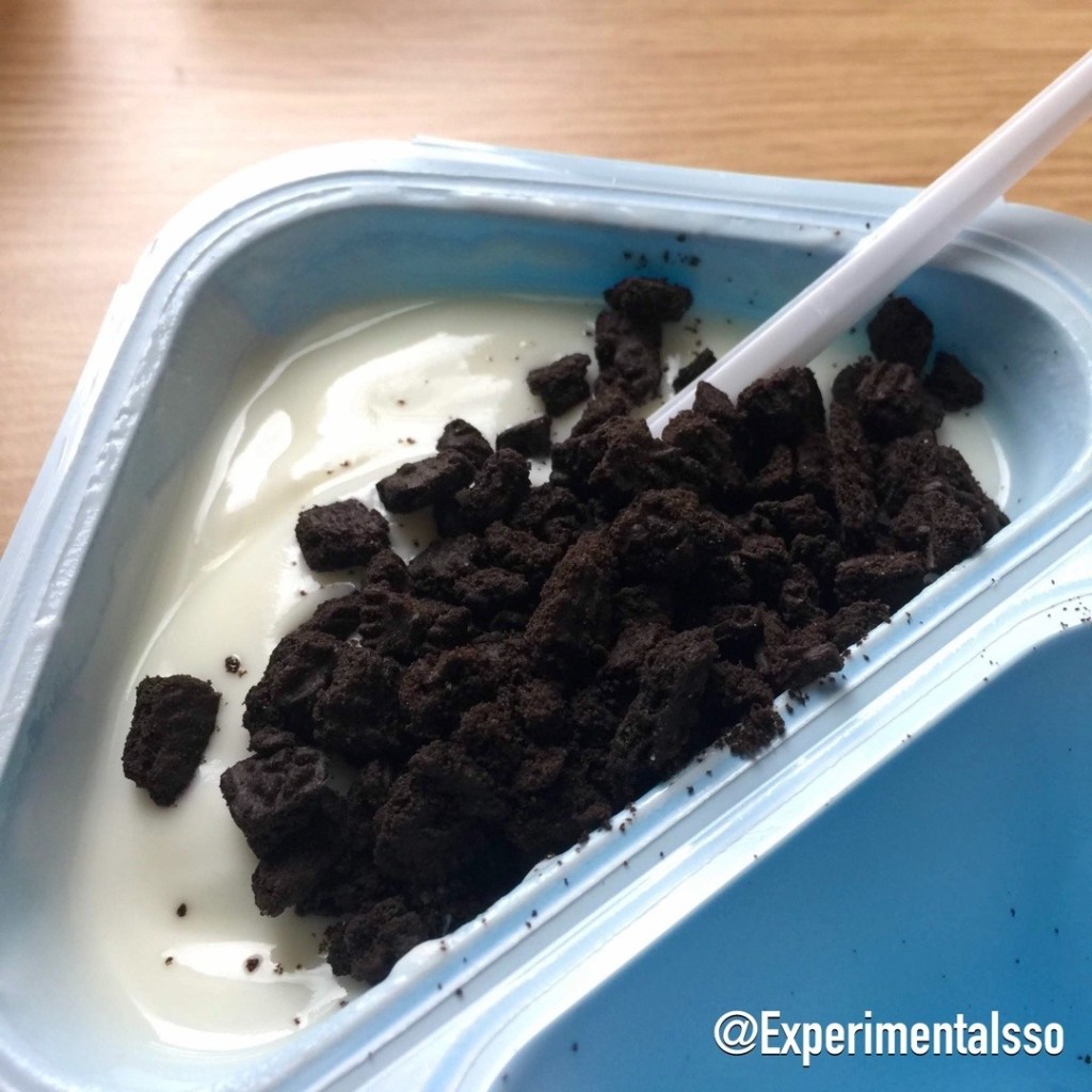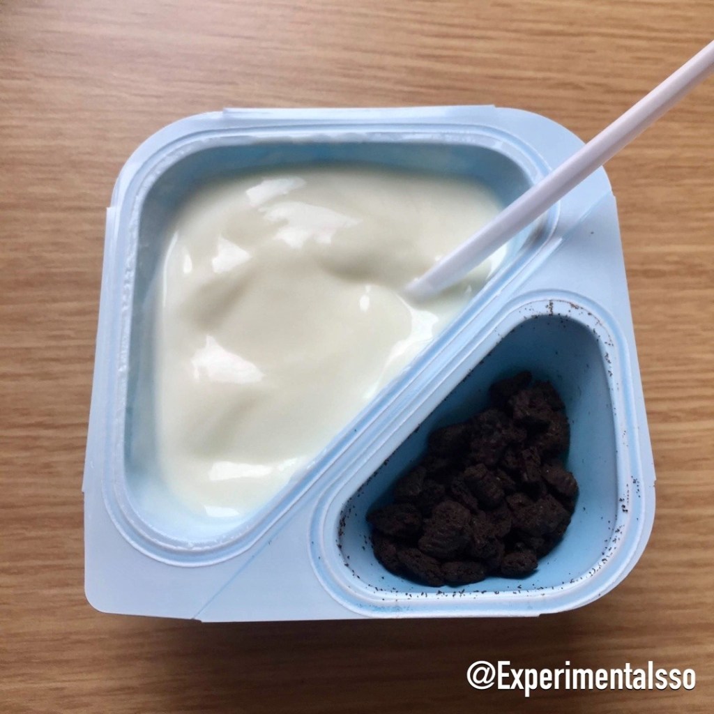 Hoje vai ser um dia de OREO! Pra começar o dia, experimentamos esse iogurte que encontramos no mercado Tesco em Londres. O iogurte vem naquela embalagem com separador no meio, numa parte vem o iogurte sabor baunilha e na outra parte os pedacinhos de biscoito picado. Até hoje não tenho certeza se existe forma certa de comer, mas o que do foi dobrar a parte da embalagem pra misturar os biscoitos no iogurte. Apesar do recheio da Oreo original ser de creme de baunilha, acho que o iogurte não combinou com os biscoitos! 😪 O iogurte não era ruim, mas ele não tinha um sabor doce. Senti um sabor azedinho nele que não casou com os biscoitos. Talvez pra nós, que não estamos acostumados a comer a Oreo com leite, realmente seja estranho essa combinação. Mas se você curte iogurte ou leite com biscoito, talvez aprecie mais que a gente!⠀
