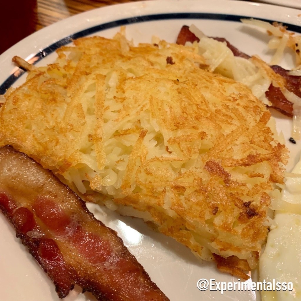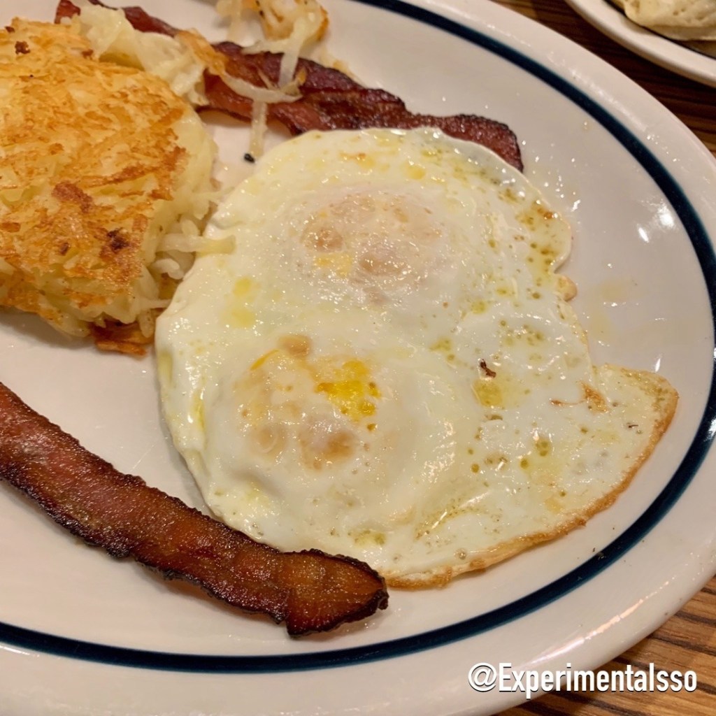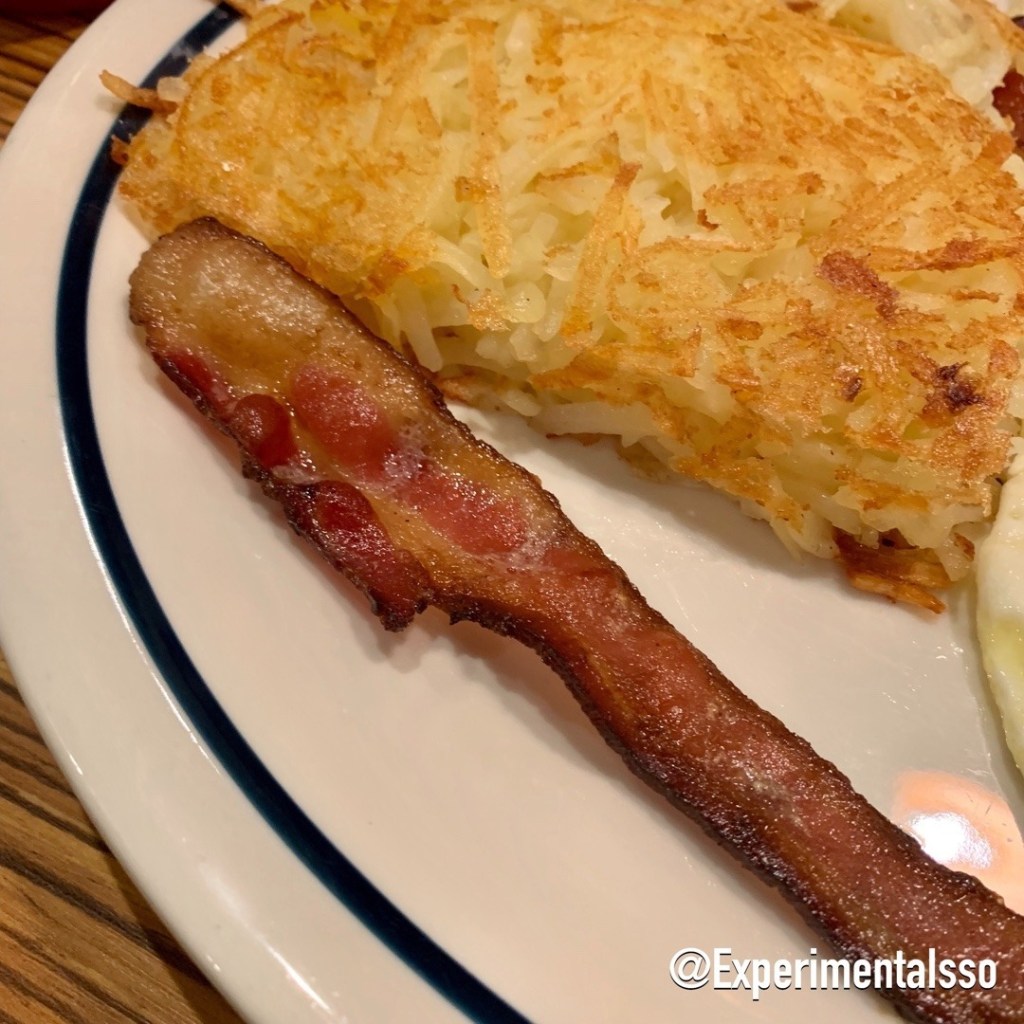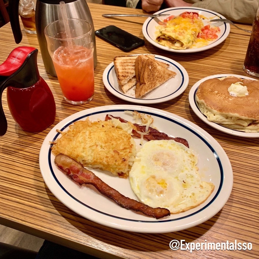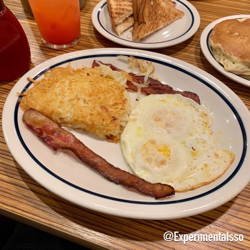 Se um dia você for viajar pros EUA não pode deixar de tomar um café da manhã ao estilo americano! Ano passado mostramos o café da manhã CARREGADO do restaurante Perkins. Esse aqui é do IHOP, um restaurante do mesmo estilo do Perkins e que serve pratos de café da manhã o dia inteiro! 😱Esse prato que pedi tinha 2 ovos fritos, 2 fatias de bacon e uma batata tipo “hash brown”. Junto com o prato também vem uma porção de torradas e uma porção das clássicas panquecas americanas com manteiga. Na mesa você sempre tem a disposição xaropes e caldas pra você colocar nas panquecas. Pra beber acabei não pedindo café e resolvi experimentar uma Splashberry que a garçonete disse que era muito gostosa… Mas devida ter ficado com o café mesmo. 😅Fora isso toda a comida estava deliciosa. Os ovos e o bacon não são muito gordurosos e a batata estava incrivelmente macia por dentro e com uma casquinha crocante por fora. O IHOP oferece diversas opções de café da manhã e dezenas de opções de almoço e janta também. Se você for conhecer o restaurante, recomendamos você experimentar o bacon de peru! É incrível!⠀