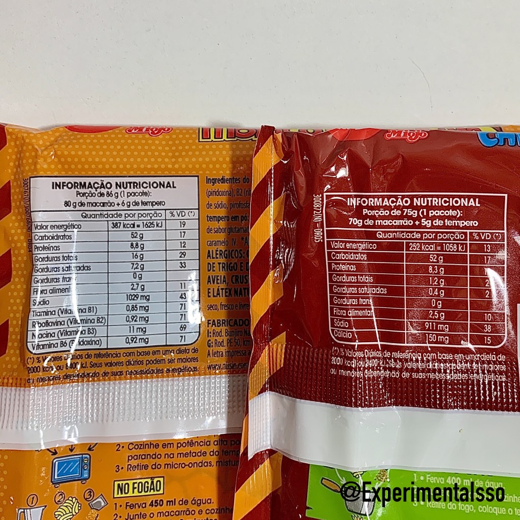 Se você olhar as duas ultimas fotos desse post, vai ver a comparação lado a lado das duas versões. A Miojo do Chico Bento vem com 10g a menos de macarrão e 1g a menos de tempero, é mais fininha, contêm ovos nos ingredientes e na tabela de informação nutricional você pode ver como os números são bem diferentes.