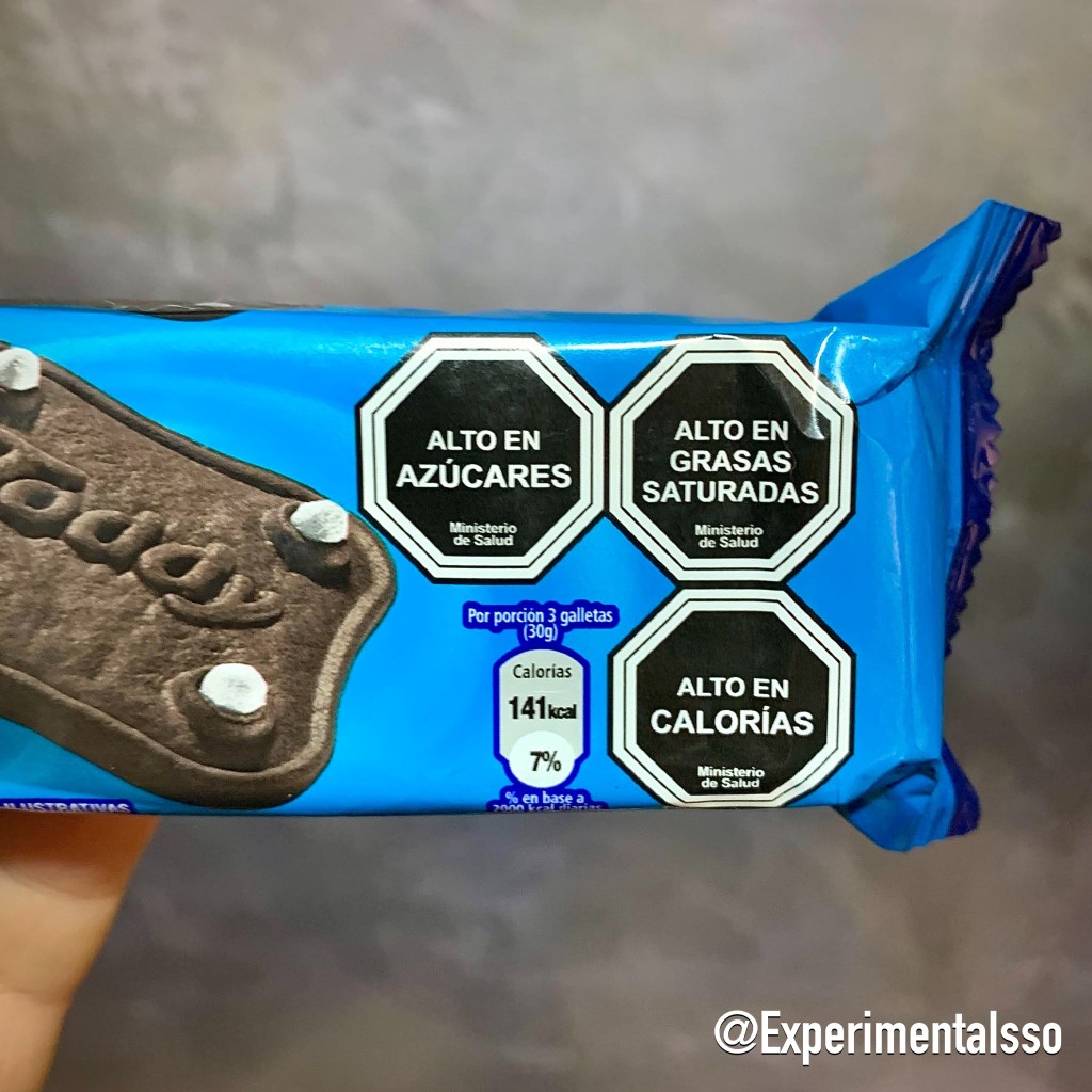 Uma coisa interessante e diferente que você pode ver na embalagem são os selos do ministério da saude avisando que o produto tem uma quantidade alta de açucares, gorduras saturadas e calorias. Esses selos fazem parte da politica de regulamentação de alimentos, adotadas pelo governo do país em 2016. Você acha que daria certo no Brasil?