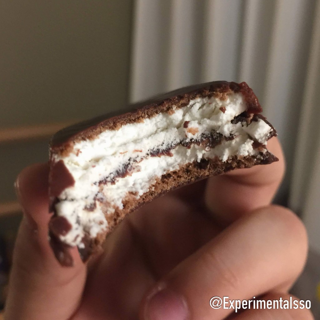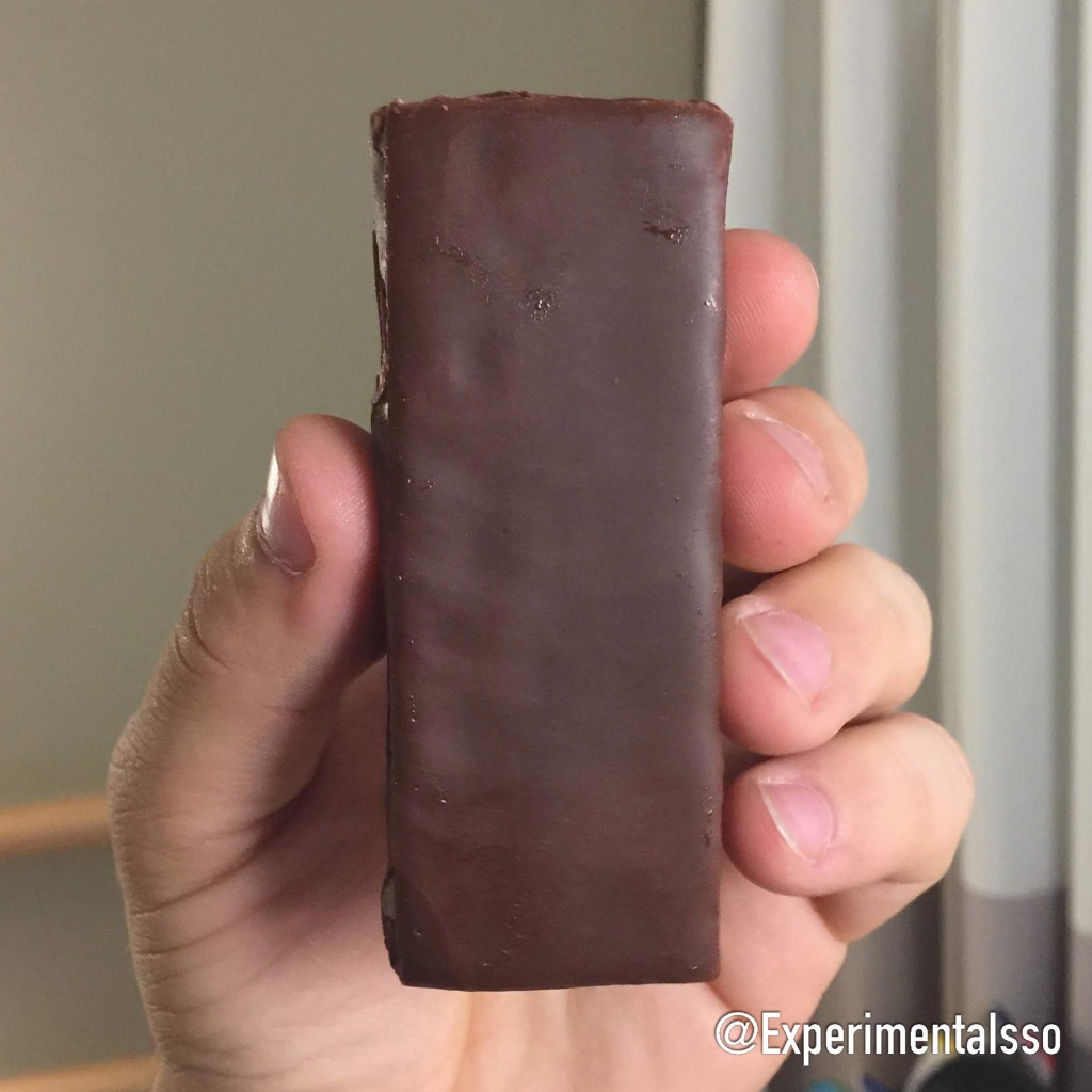 A composição dele também é bem diferente. Ele começa com uma camada de chocolate cremoso no meio, em cima disso tem uma camada cremosa sabor leite, em cima disso uma camada muito fina (muito fina mesmo) de bolinho de chocolate e por fora disso tudo, ele tem uma cobertura de chocolate ao leite.