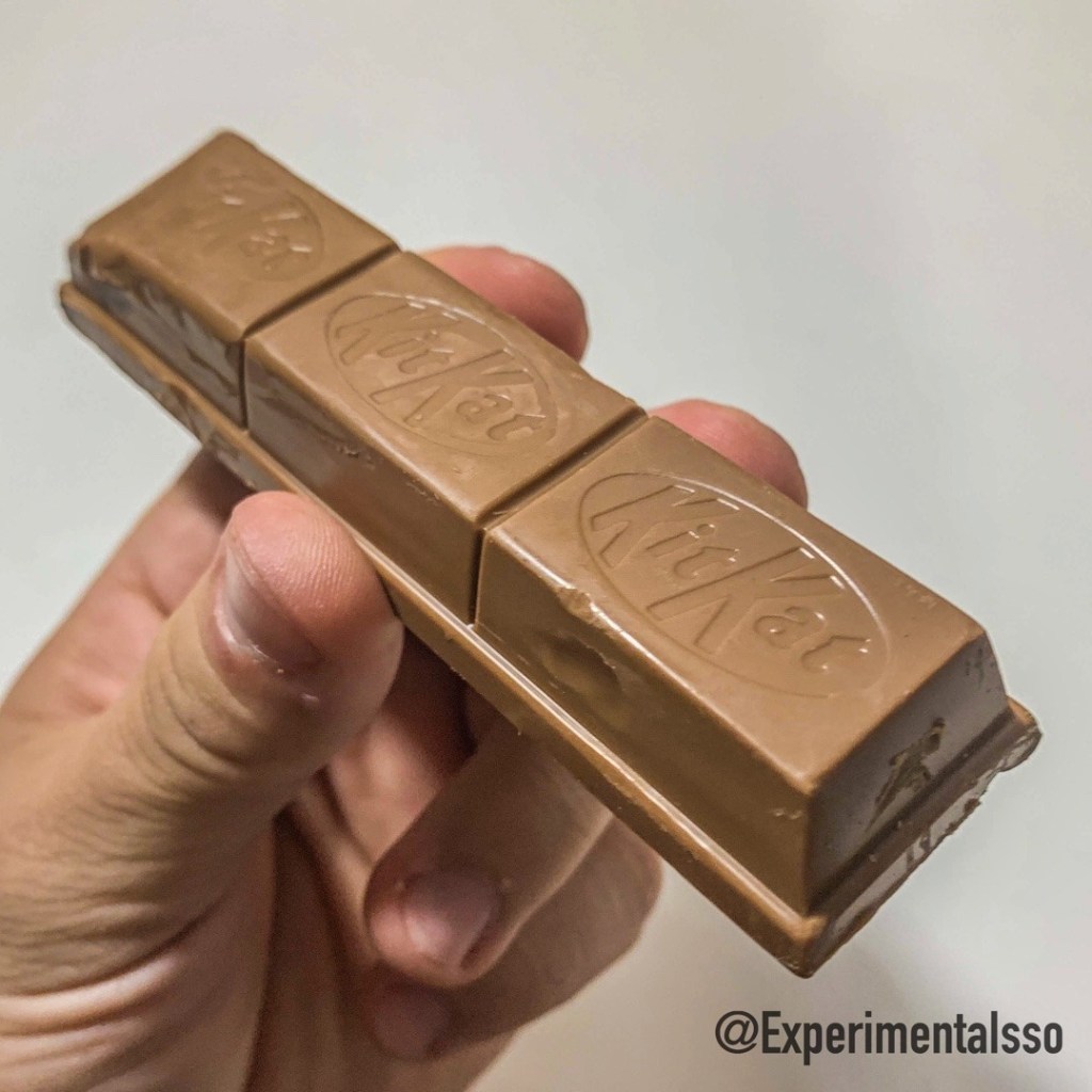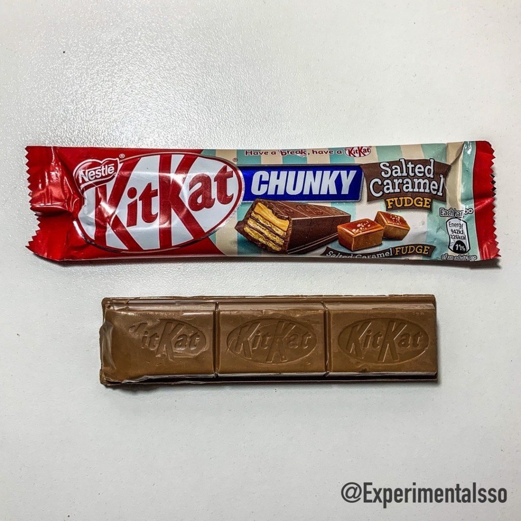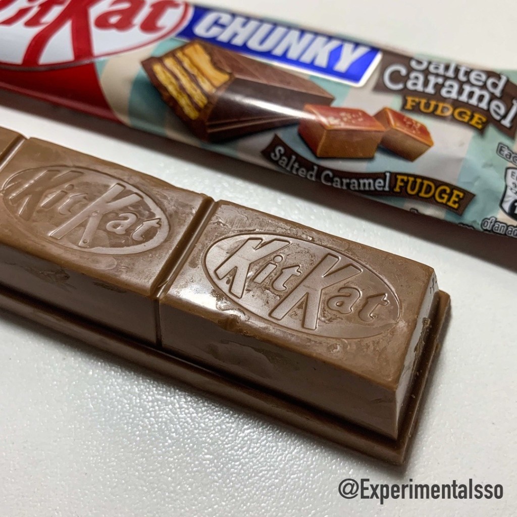 Um KitKat importado que é vendido aqui no Brasil Ele é do tipo Chunky, ou seja é maior, tem apenas 3 pedaços e tem um recheio extra entre o wafer e a cobertura. O recheio desse aqui lembra uma “bala de caramelo salgado”. Ele não é tão cremoso como o recheio de caramelo de um Twix por exemplo. O sabor do caramelo salgado dá um toque bem diferente ao KitKat, ele é bem gostoso, mas ficaria mais legal se o recheio fosse mais cremoso…