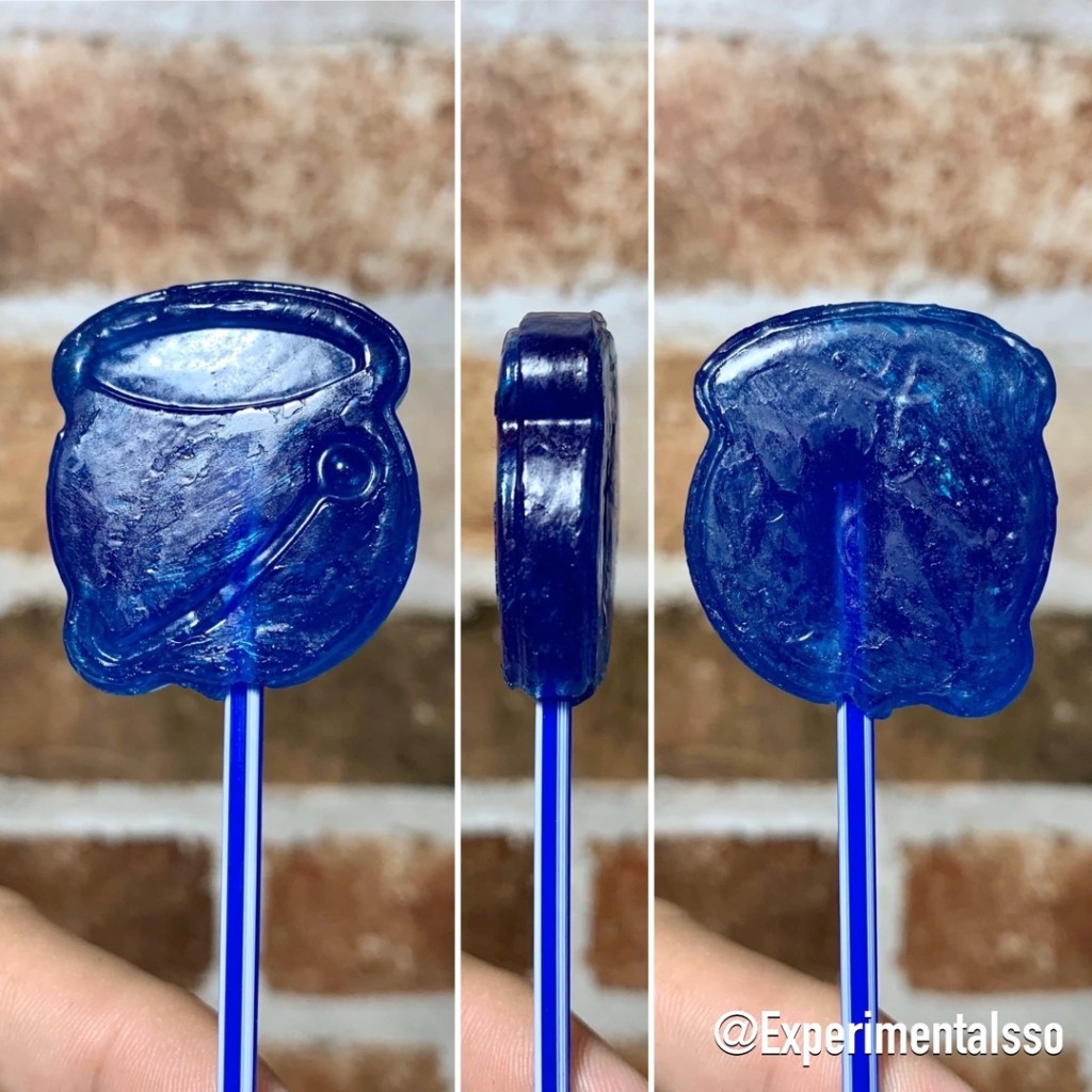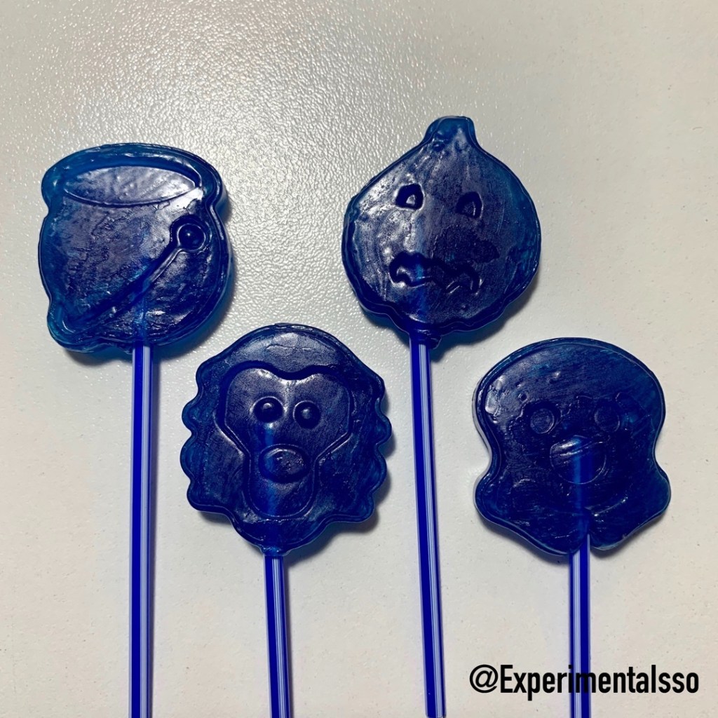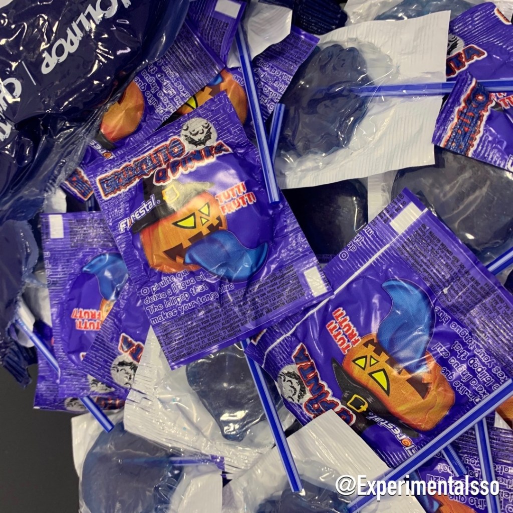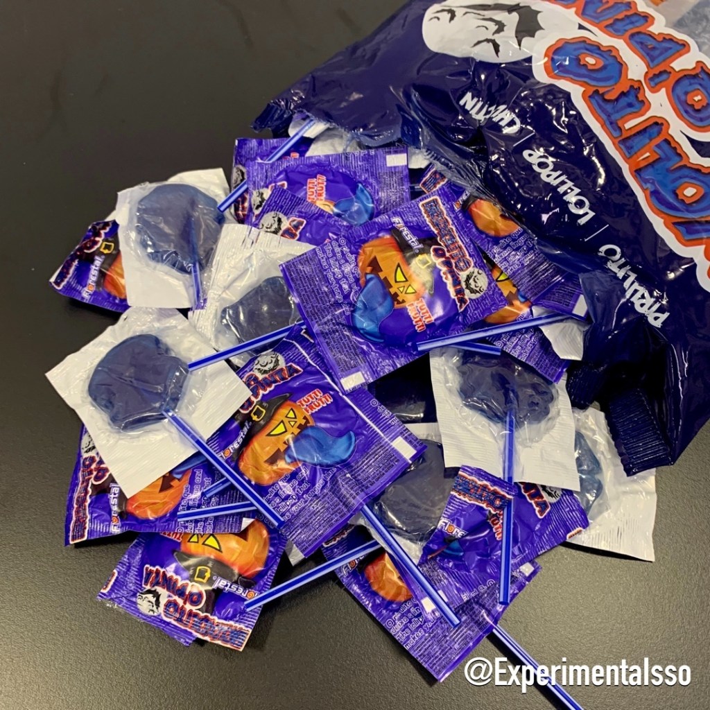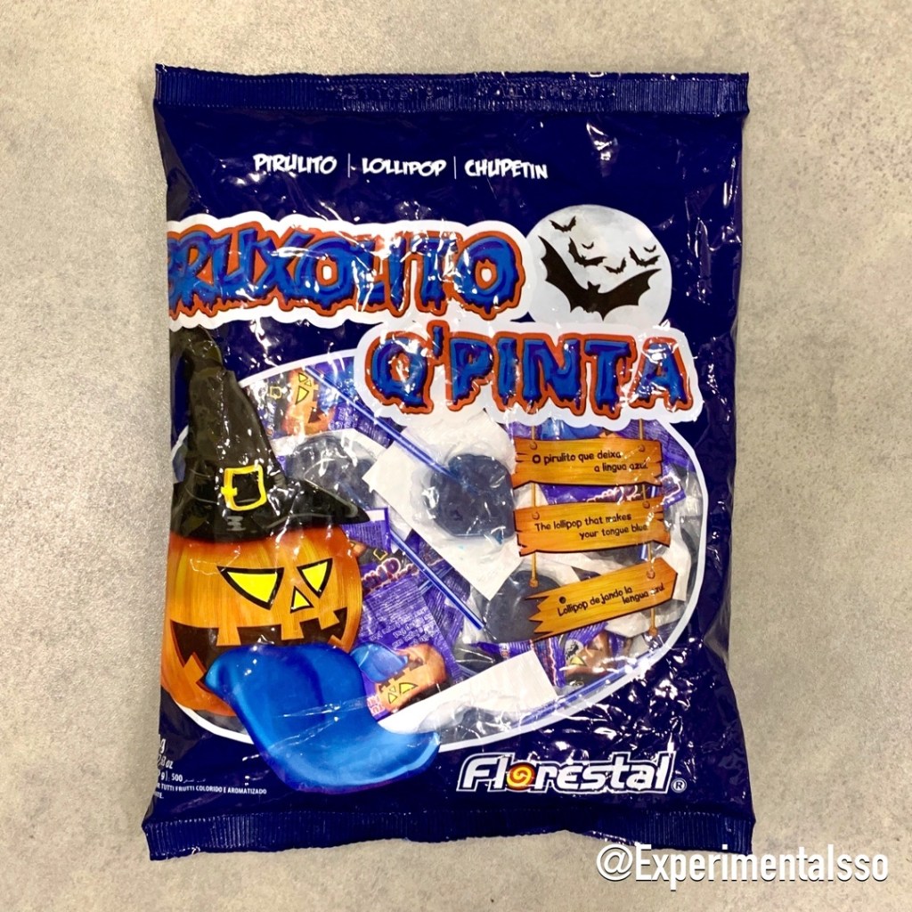 Esse é um clássico da nossa infância! La no sul no final dos anos 90 esse era um dos pirulitos que vendiam no nosso colégio! Achamos incrível ele ainda existir e todo ano compramos pro Halloween! Ano passado mostramos versão que deixa a tatuagem na língua! Chegaram a ver? Esse aqui é a versão que pinta a língua de azul e tem sabor de framboesa! 👍
