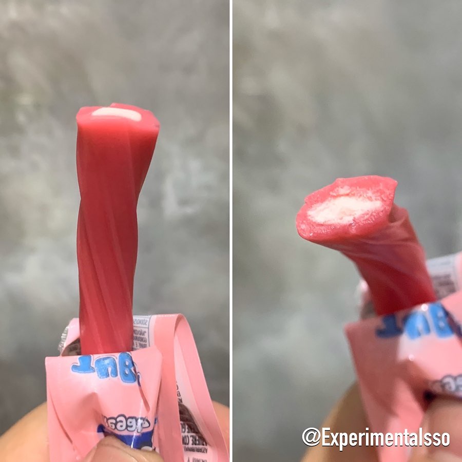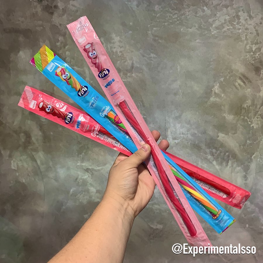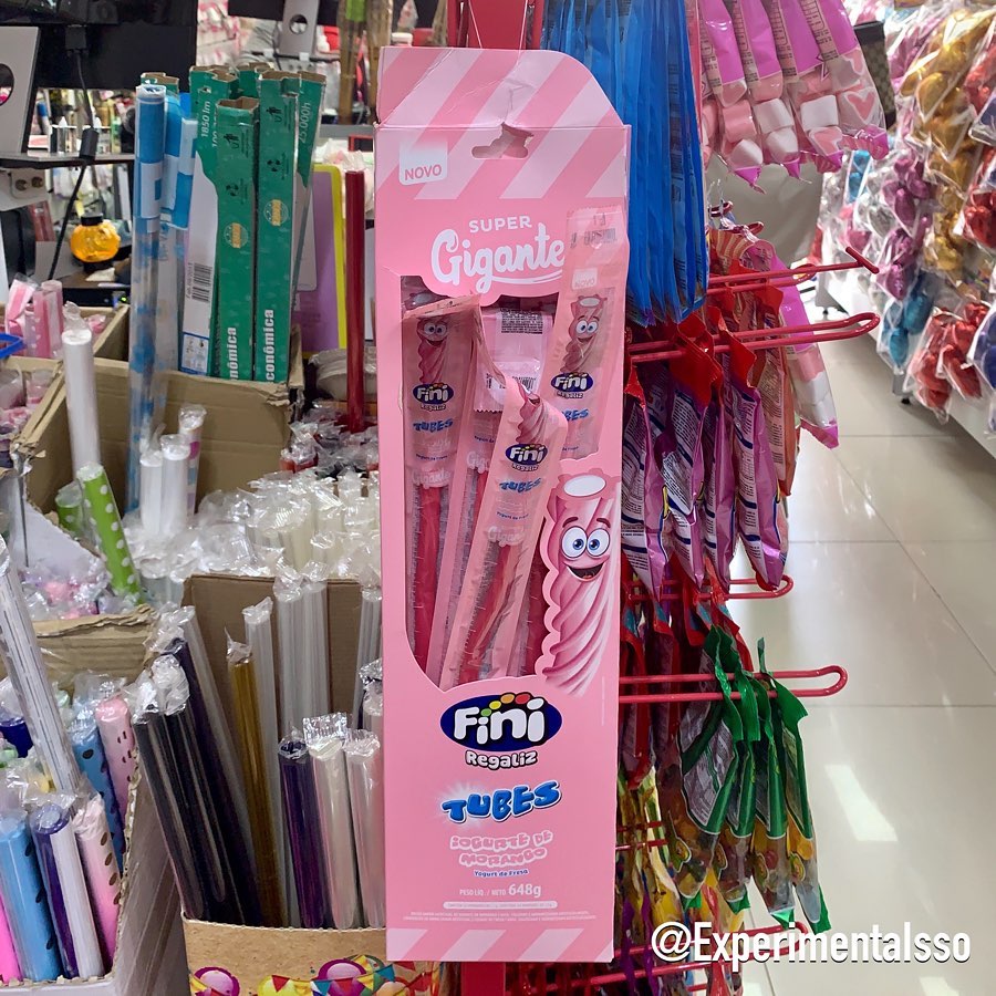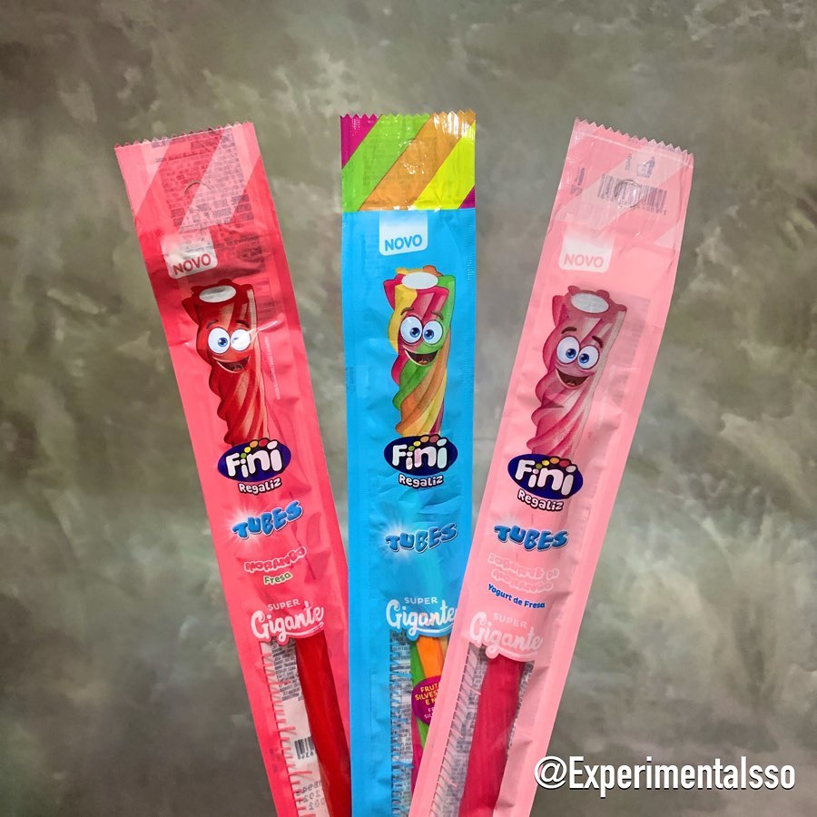 Adoramos novidades da FINI! Além do formato gigantão desses tubes um deles tem, um sabor novo de iogurte com morango! É uma delícia!