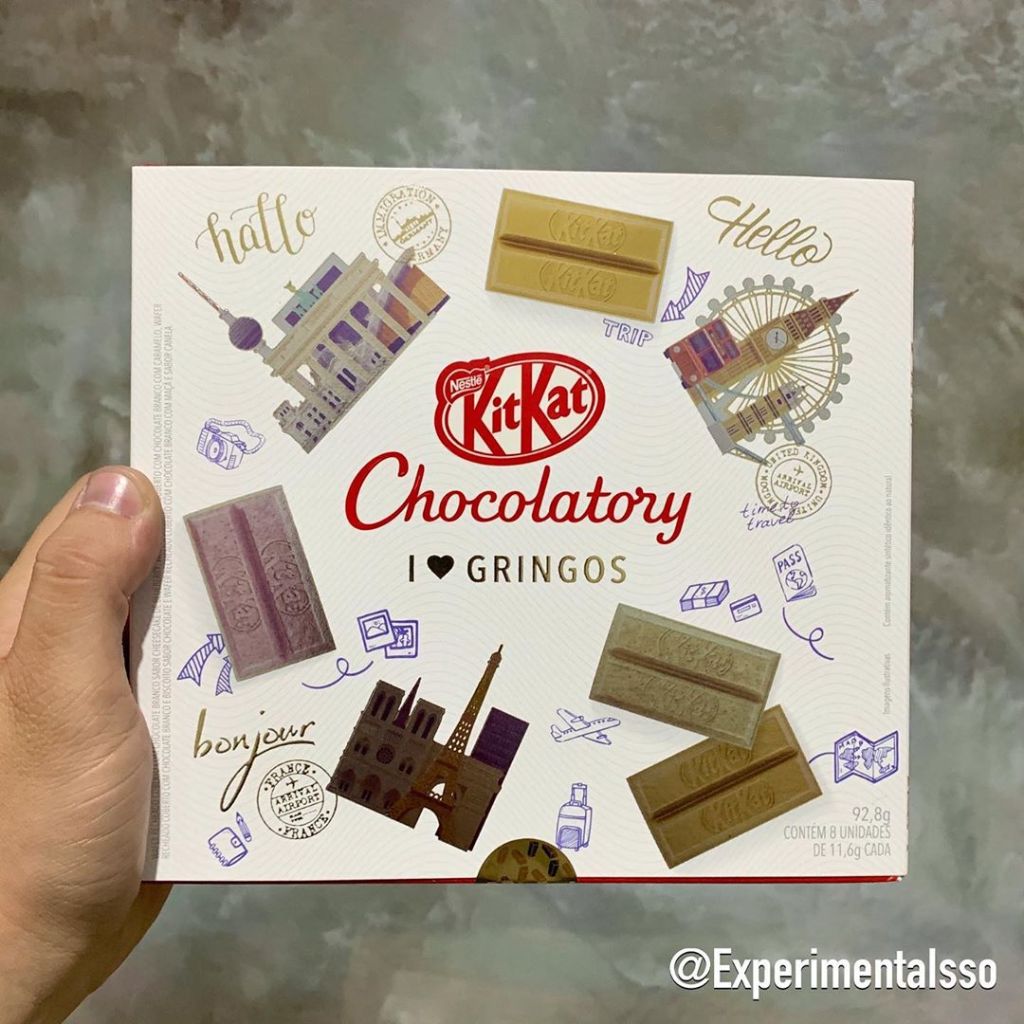 Essa é uma caixinha muito especial que você pode comprar no KitKat Chocolatory com 4 sabores de chocolate Gringos! Tem Maçã com Canela, Caramelo, Cheesecake de Mirtilo e Cookies & Cream! Todos são uma delícia, principalmente o de Caramelo e o de Maçã com Canela!