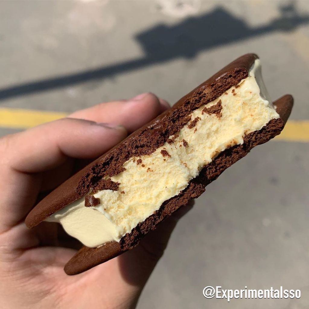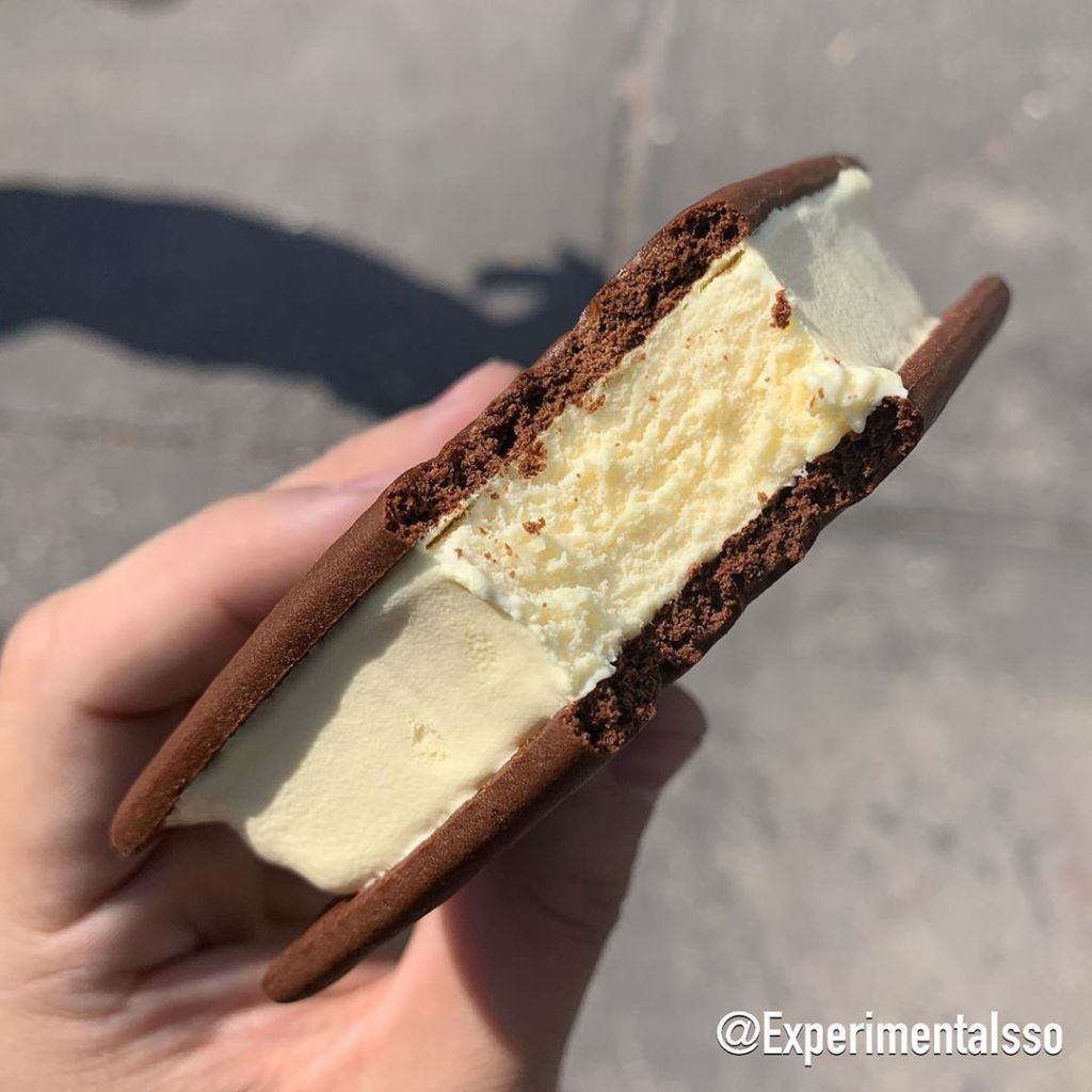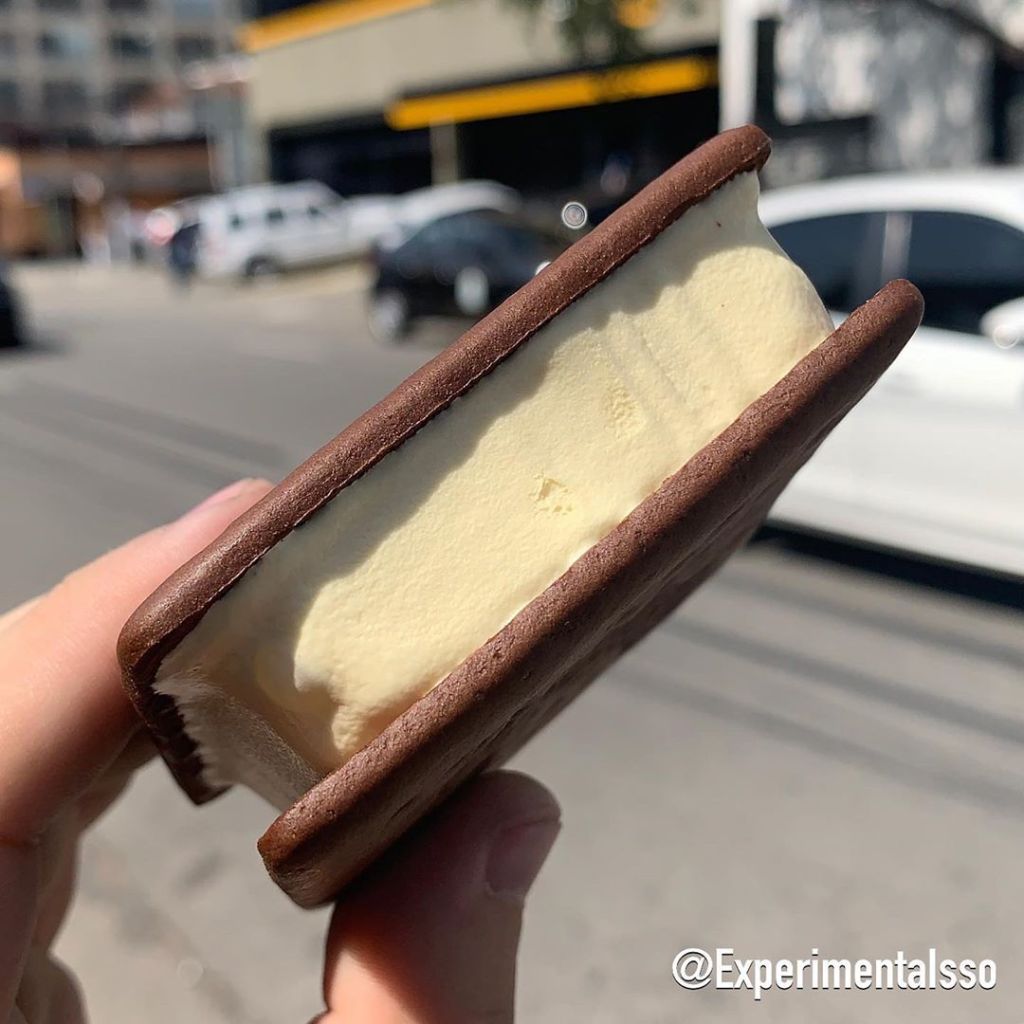 Finalmente o sanduíche de sorvete da Kibon apareceu! E é uma delicia! 😁 O sorvete do meio dos biscoitos é baunilha e é bem cremoso e firme. Ele demorou bastante até começar a derreter nos cantinhos. Os biscoitos que “fazem o sanduíche” são sabor chocolate e são muito gostosos também. Como outros sorvetes desse tipo, o biscoito não chega a ser crocante, mas também não estava mole, ele estava sequinho e com aquela consistência de “Cookie macio”. Estava muito gostoso mesmo! Nós amamos! ❤️❤️❤️