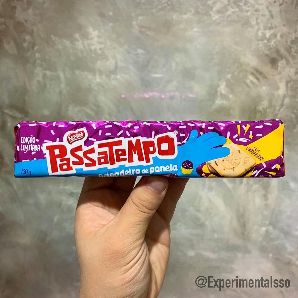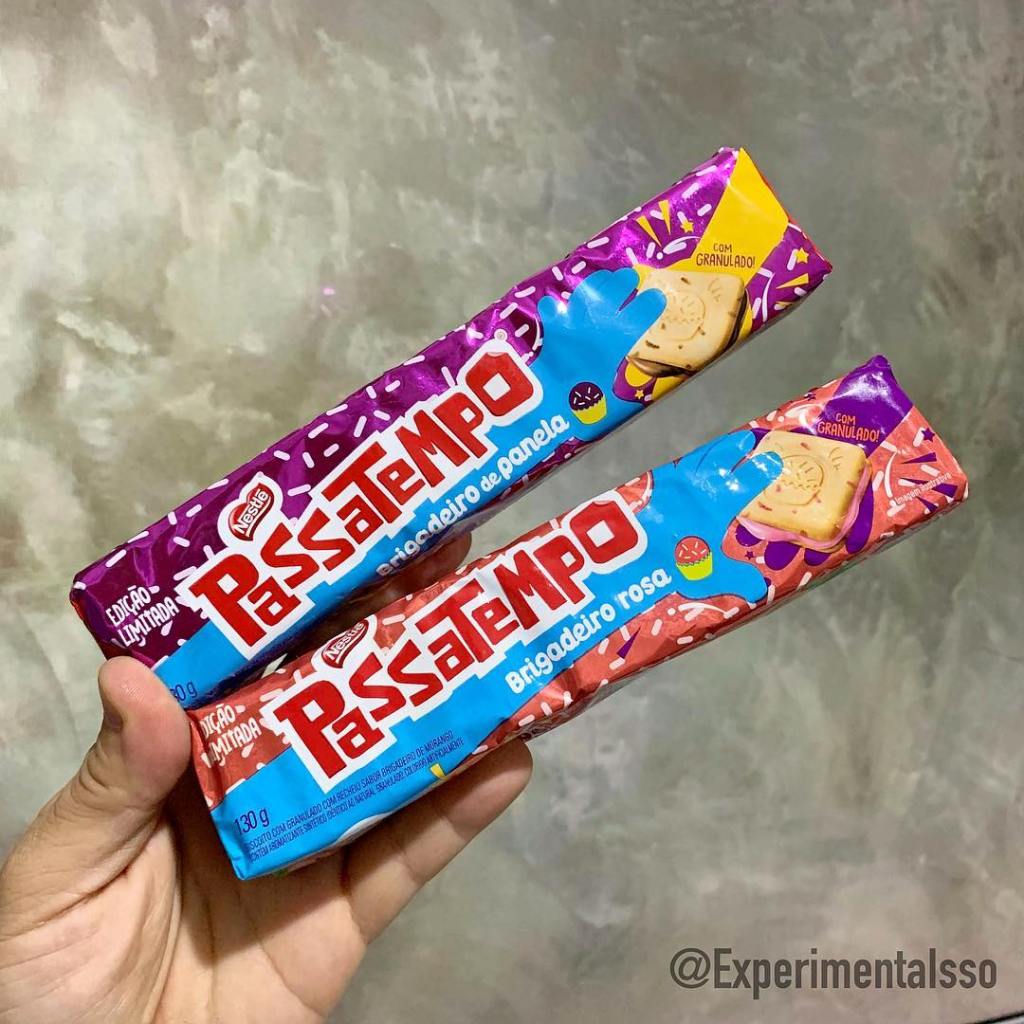 Brigadeiro de Panela e Brigadeiro Rosa esses são os novos sabores de Passatempo! Com direito a granulado no biscoito! 😆 O sabor que mais gostamos foi o “Brigadeiro Rosa”! Não lembra exatamente o sabor de um doce feito com Leite Condensado mas ainda sim é gostoso! E os desenhos com tema de festa de aniversário são muito bonitinhos! 🎂🍭🎁🎈