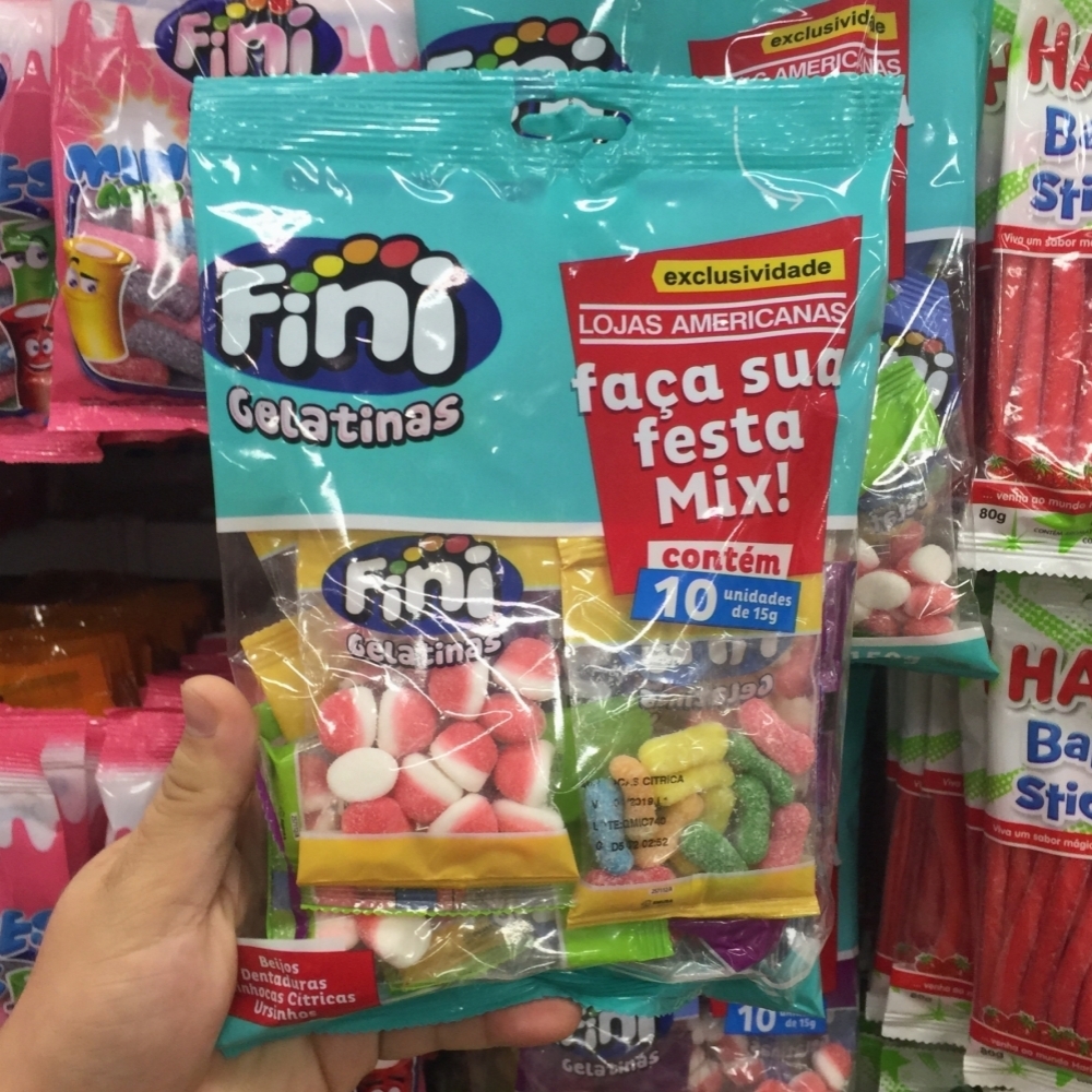 Mais um exclusivo das lojas Americanas! Um pacotão de pacotinhos de Mini Fini! São 10 pacotinhos sortidos que variam entre mini beijos, mini minhocas cítricas, mini dentaduras e mini ursinhos. No nosso pacote não chegou a vir nenhum ursinho na verdade…É uma ideia interessante pra quem gosta de comer porções pequenas ou gosta de dar pras crianças a porção contada! O sabor é o de sempre, num geral tem uma nota 9/10. Pagamos 9,99 pelo pacotão. #ExperimentaIsso #Fini