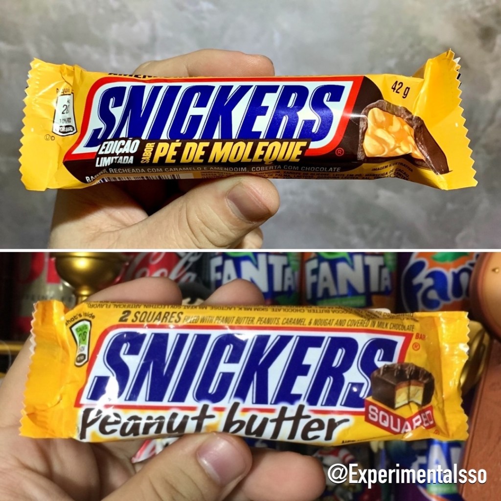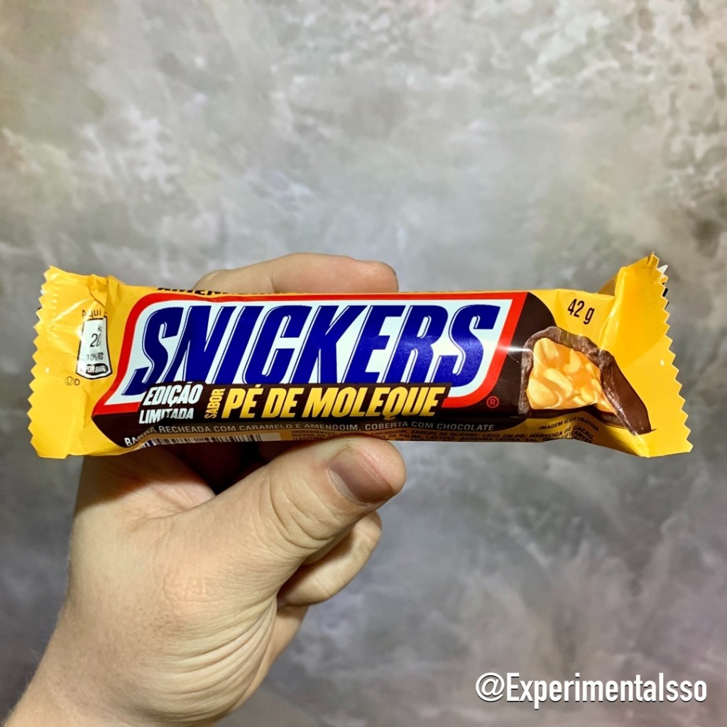 uma curiosidade que queremos compartilhar com vocês é que a embalagem dessa versão sabor Pé de Moleque tem a mesma cor da embalagem do Snickers “Peanut Butter” lançado alguns anos atrás nós EUA. Nós experimentamos em 2017 aqui no Experimenta Isso, mas você pode rapidamente ver a foto da comparação das duas embalagens aí no carrossel de fotos! ⠀