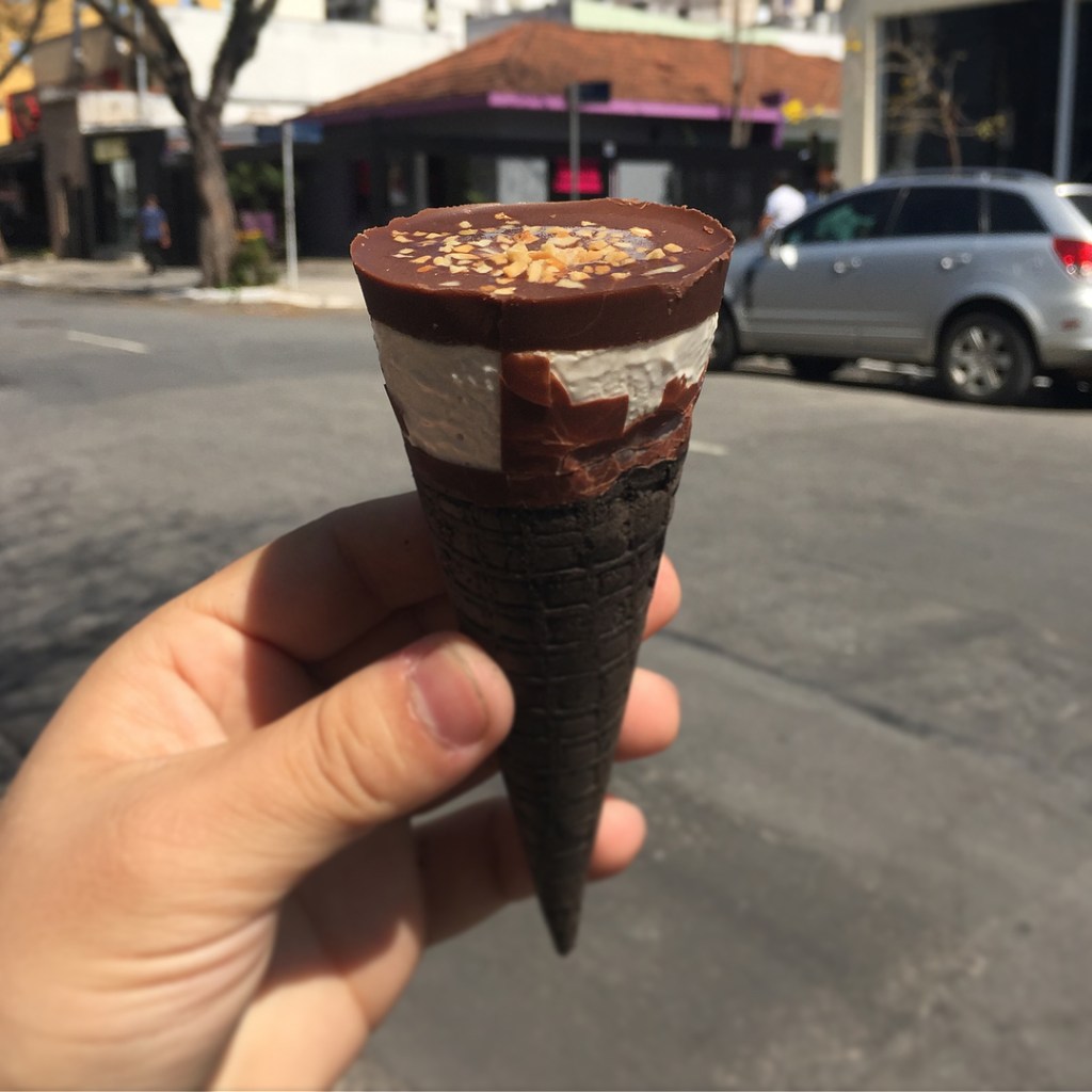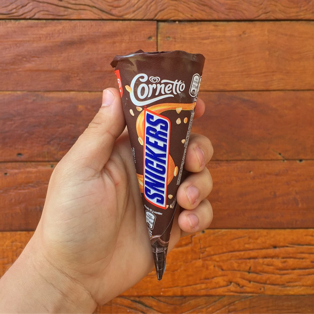 😋😋 Novo Cornetto Snickers da Kibon! Demorou um pouquinho pra chegar no recheio de caramelo, mas quando chegou, foi INCRÍVEL! 😋 Nota: 7/10 (Por que o sorvete em si deixa um pouco a desejar) #ExperimentaIsso #snickers #cornetto #chocolate #caramelo #caramel #amendoim #peanut #icecream #sorvete