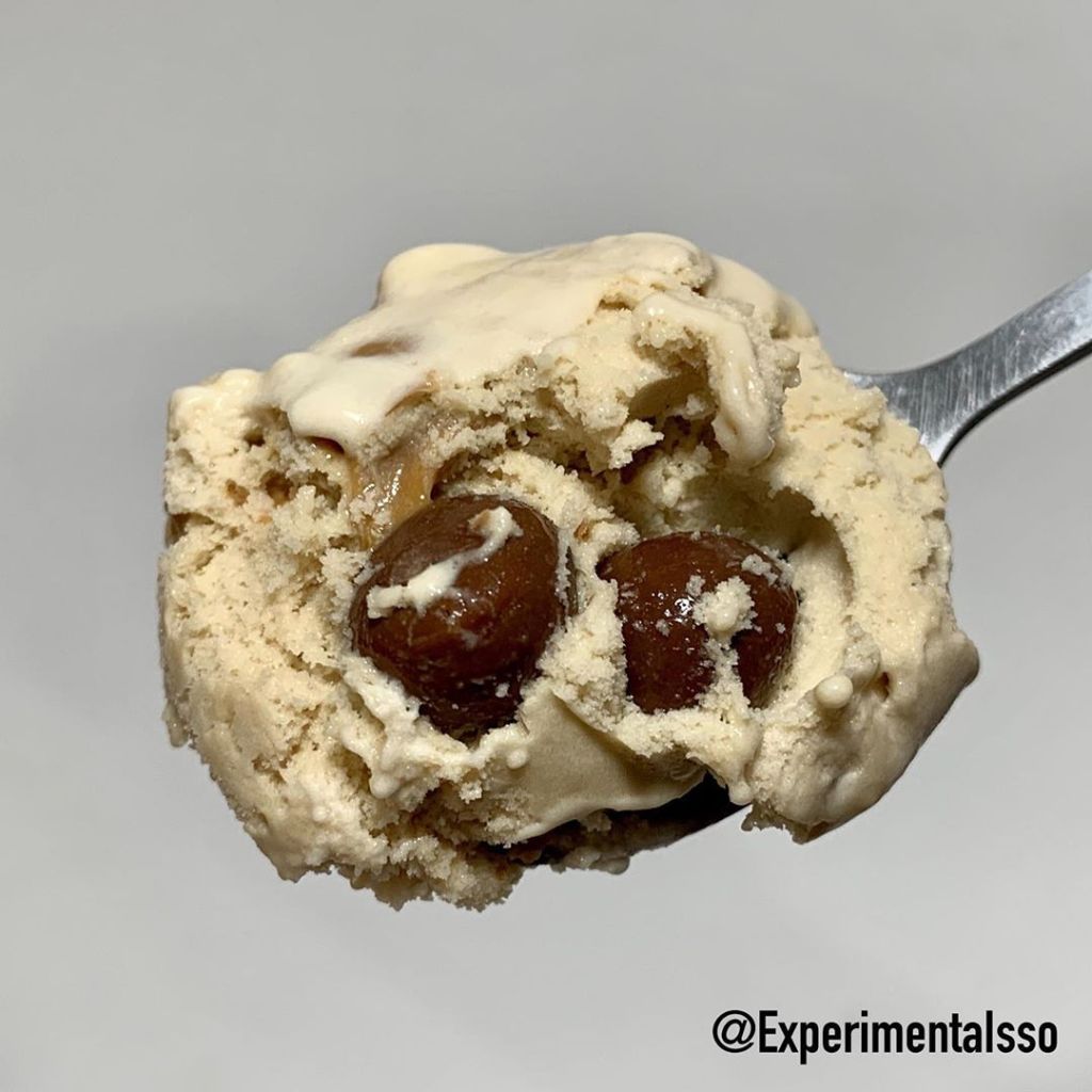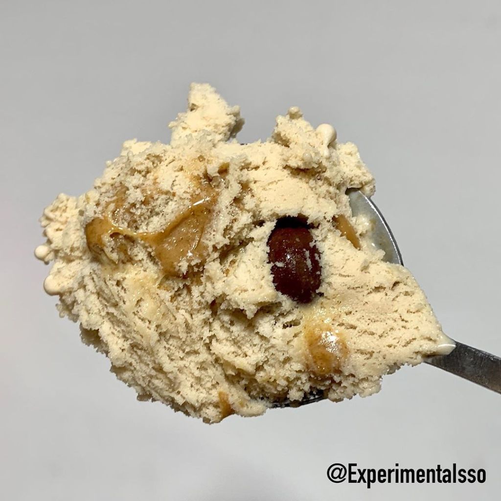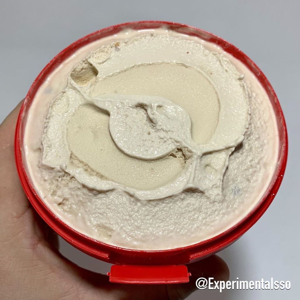 O sorvete tem sabor caramelo, com calda de caramelo e pedaços de biscoito cobertos com chocolate misturados na massa.