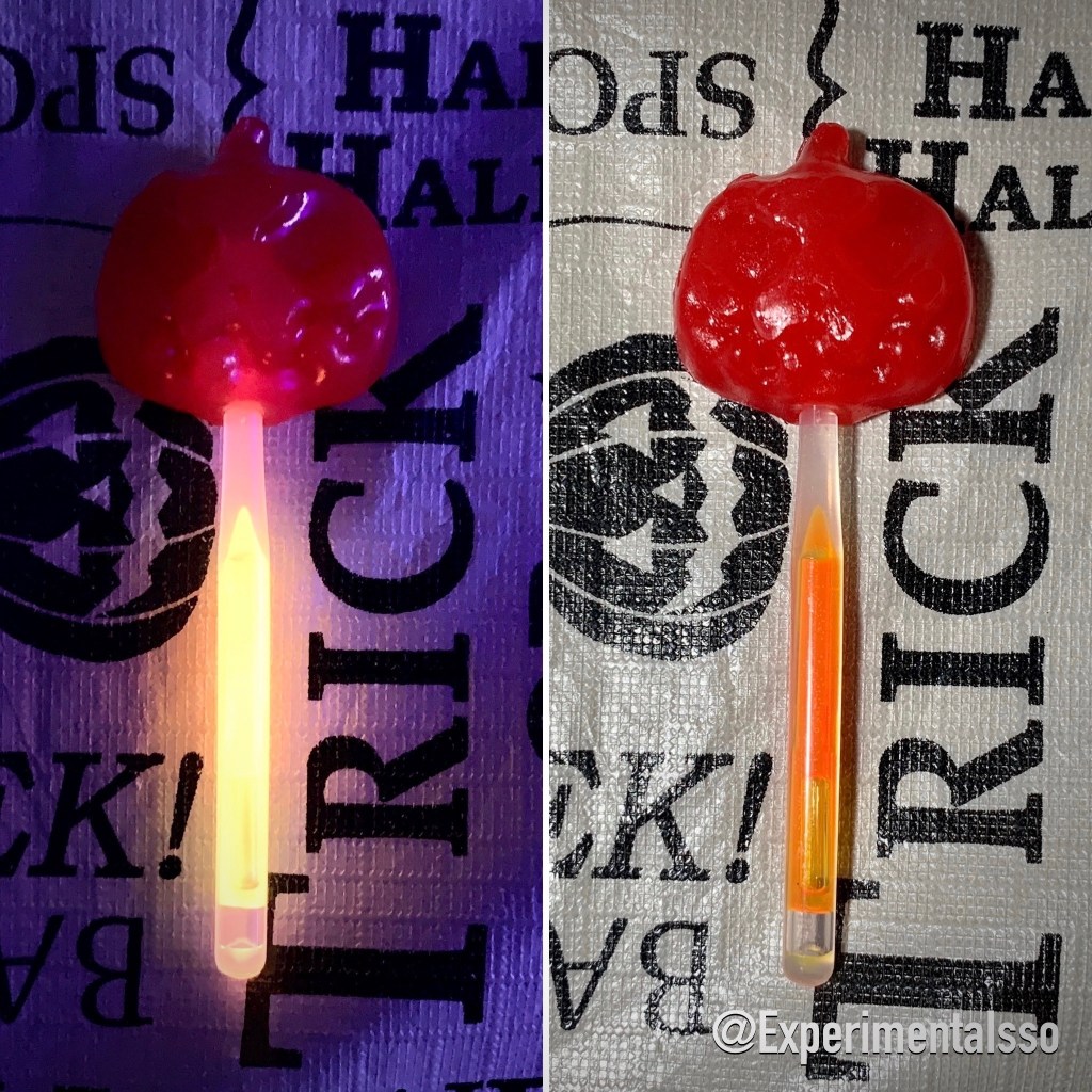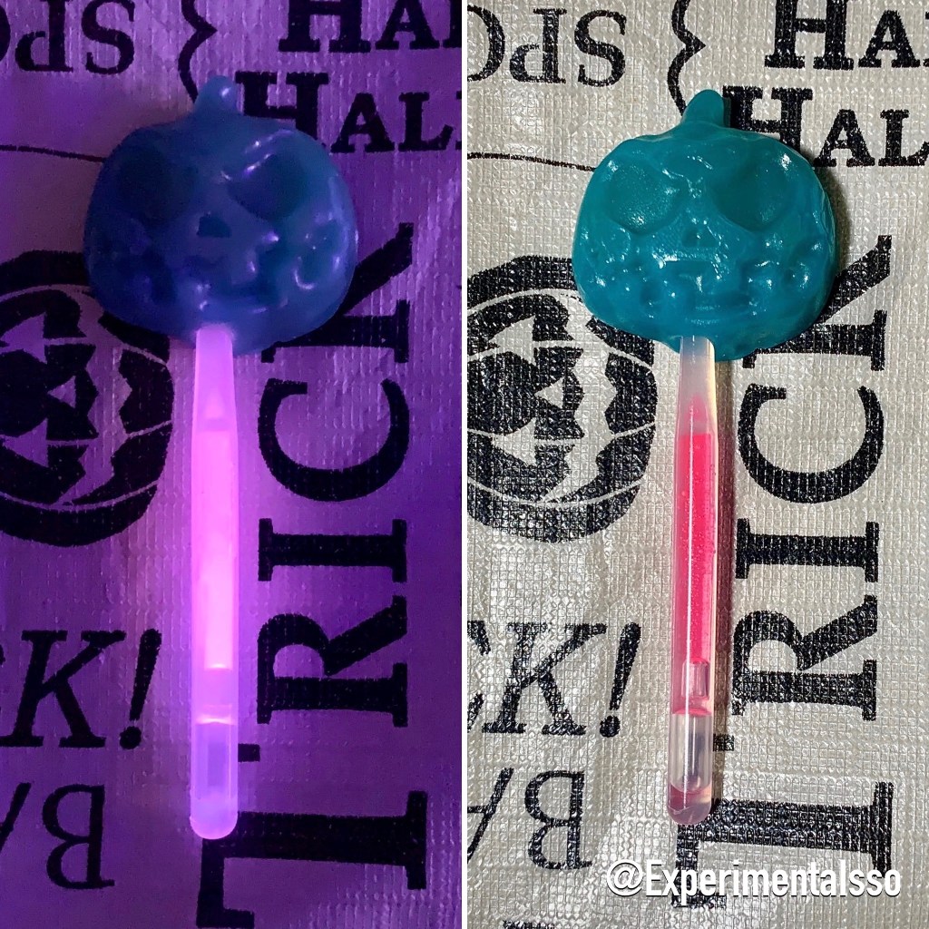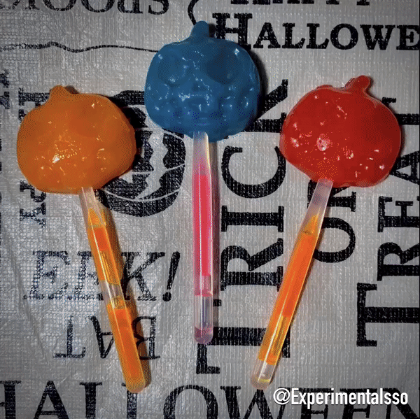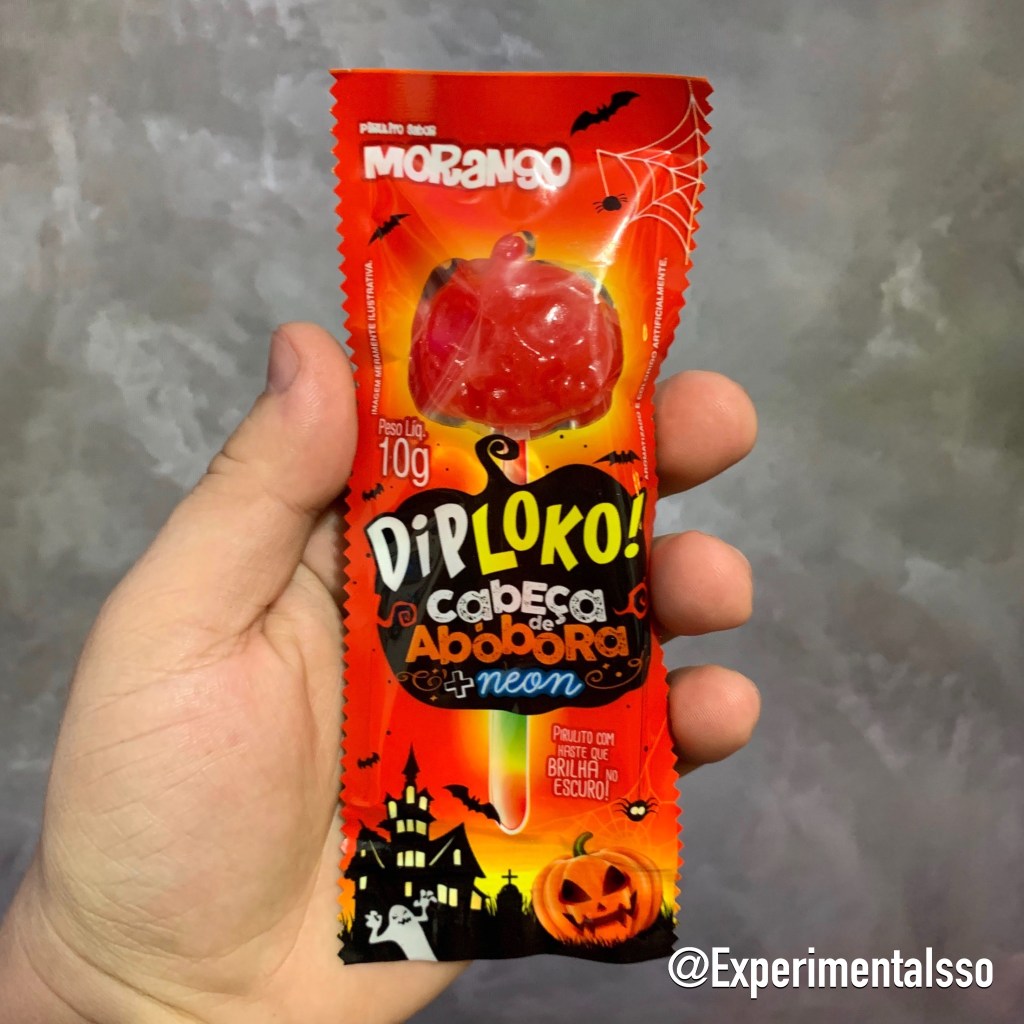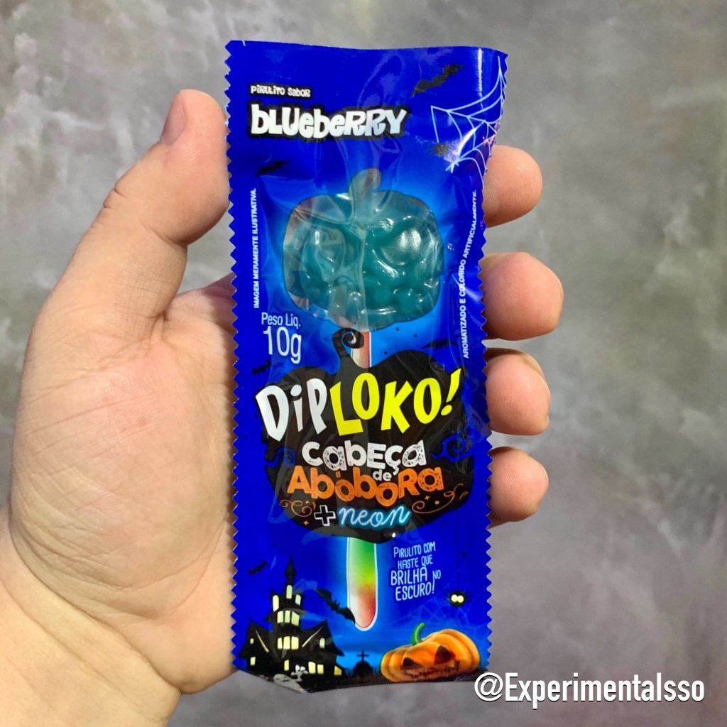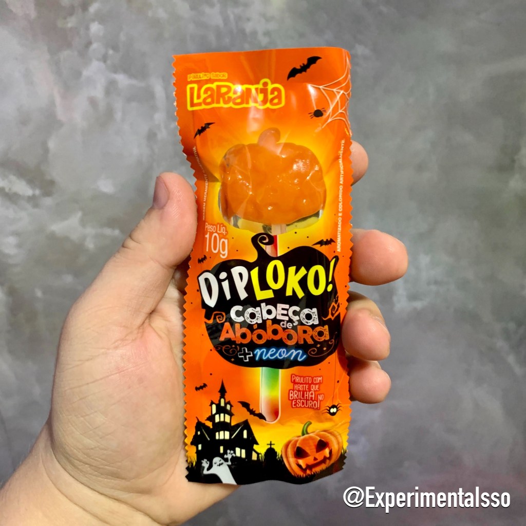 Outro doce que é a cara do Halloween é o DipLoko Cabeça de Abóbora! São 3 sabores diferentes: Laranja, Morango e Blueberry. E cada pirulito vem com uma haste de neon que brilha no escuro.