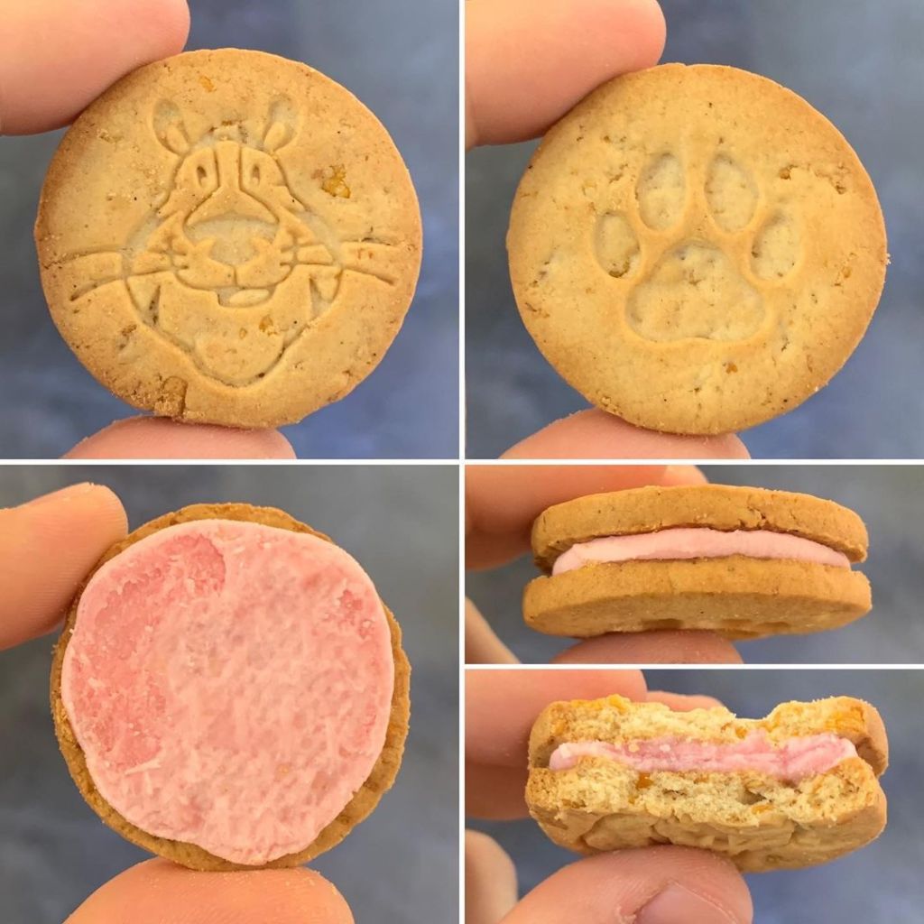 O sabor Morango com Leite tem biscoito de baunilha com pedacinhos de Sucrilhos e recheio de morango.