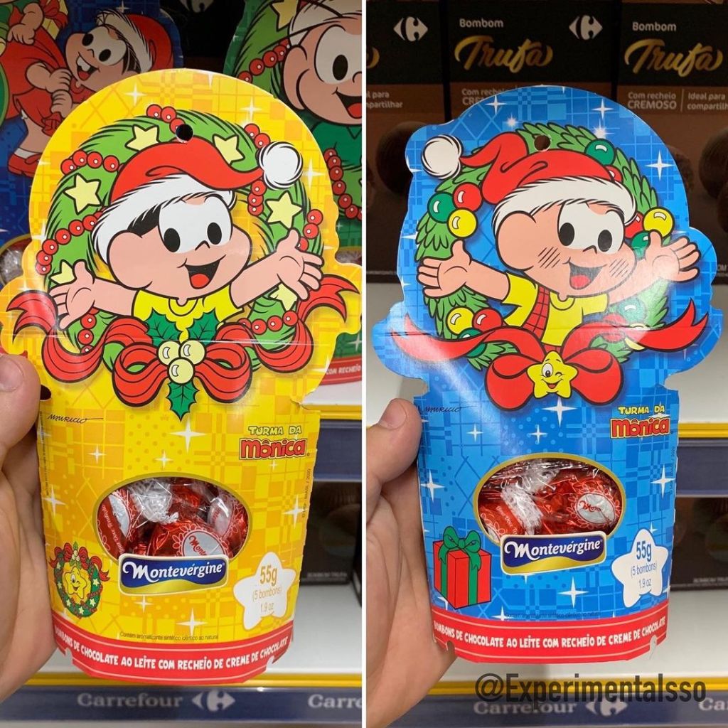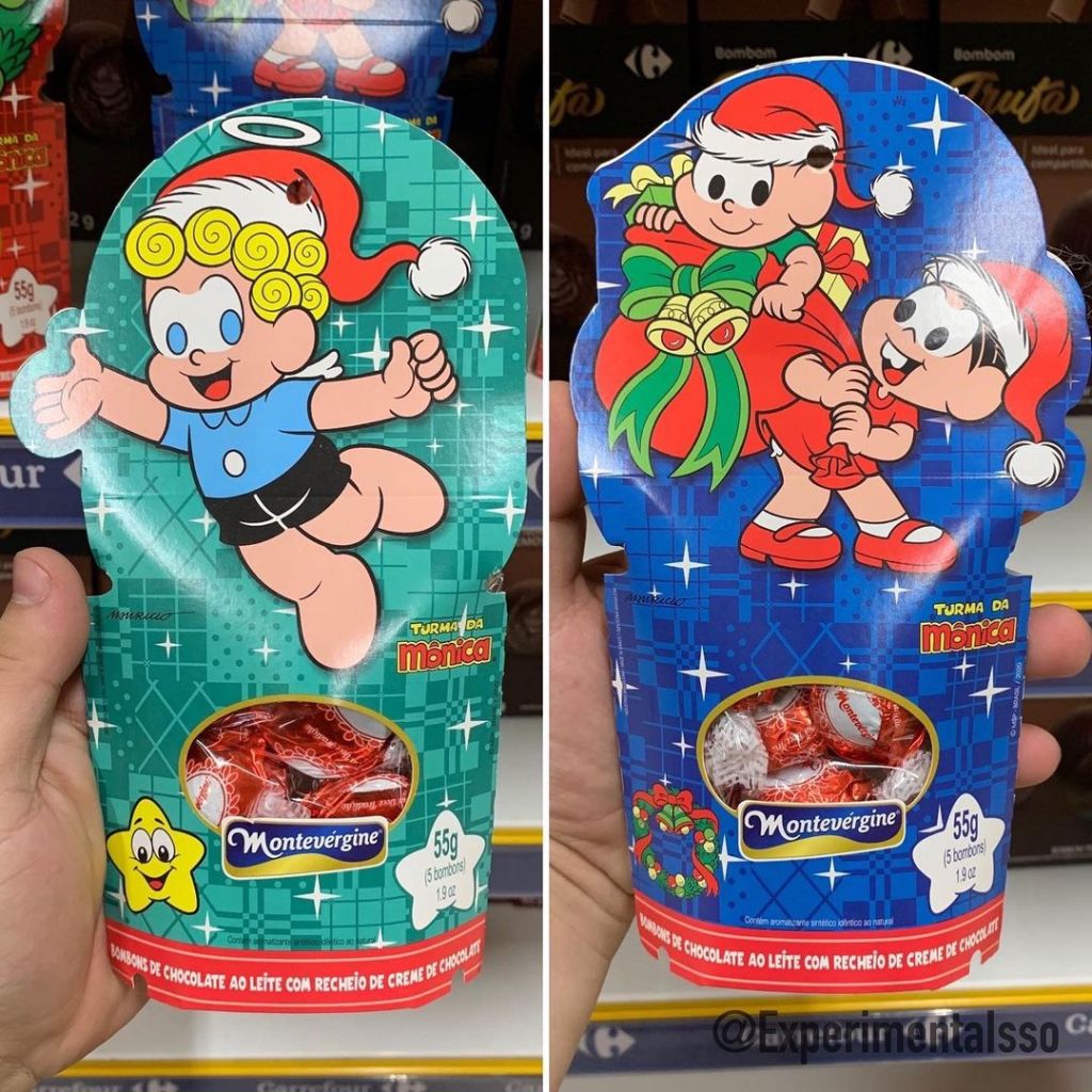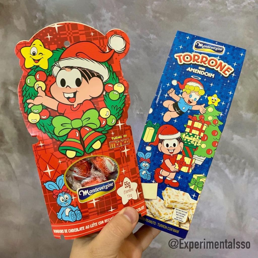 Os bombons são de chocolate ao leite com recheio de creme de chocolate. São 7 modelos de embalagens com os personagens da Turma! 😁 Os torrones com amendoim acho que todos já conhecem. 😋 Eles vem embalados individualmente e também ganharam uma embalagem temática pra esse Natal! ☺️
