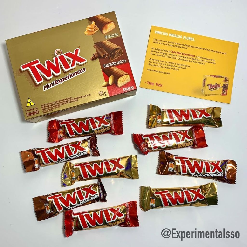 Essa é a proposta do Mini Experiences. Uma edição limitada com 9 unidades de Twix na versão “mini”. São 3 unidades de cada sabor: Caramelo, Triplo Chocolate e Paçoca.