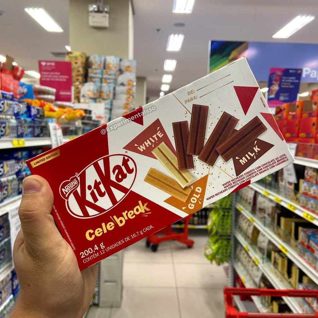 Ela vai e volta…Desde 2017 acompanhamos o reaparecer da caixa Celebreak no mercado. Esse ano ela apareceu um pouco mais modesta, sem a abertura central da caixa, deixando de lado a versão mini do KitKat Dark e adicionando o mais novo KitKat Gold (mini) dentro da caixa.