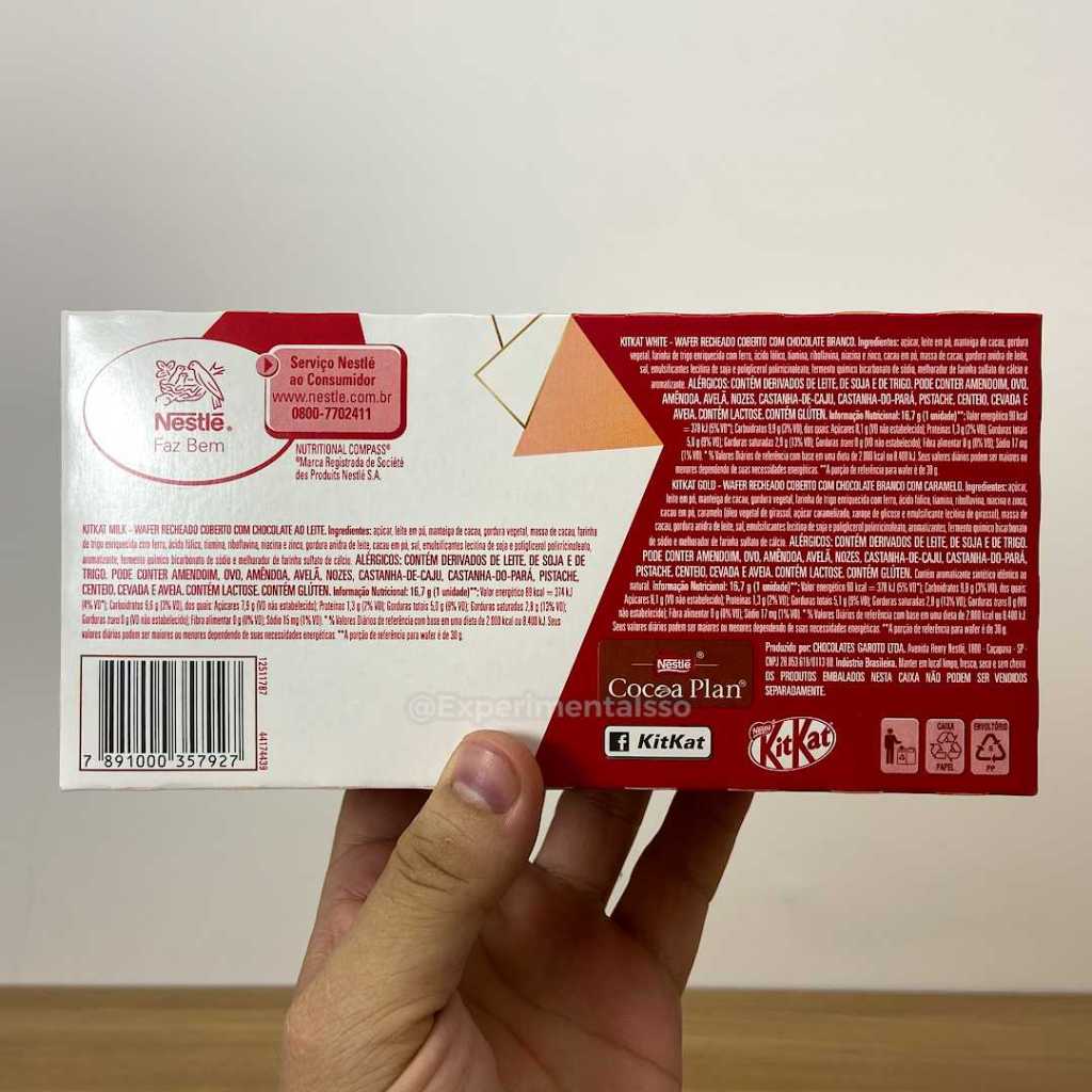 No total são 12 unidades de KitKat Mini, sendo 6 KitKat Mini Milk (ao leite), 6 KitKat Mini White (Chocolate Branco) e 6 KitKat Mini Gold (Chocolate branco com caramelo).