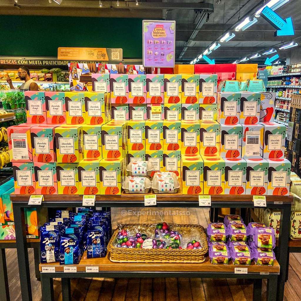 São várias opções de Ovos de Chocolate! Tem o Chocolate Dragê, com confeitos coloridos, o clássico de chocolate ao leite, chocolate crocante com castanhas de caju, chocolate recheado com creme de avelã e o de chocolate 70% cacau.