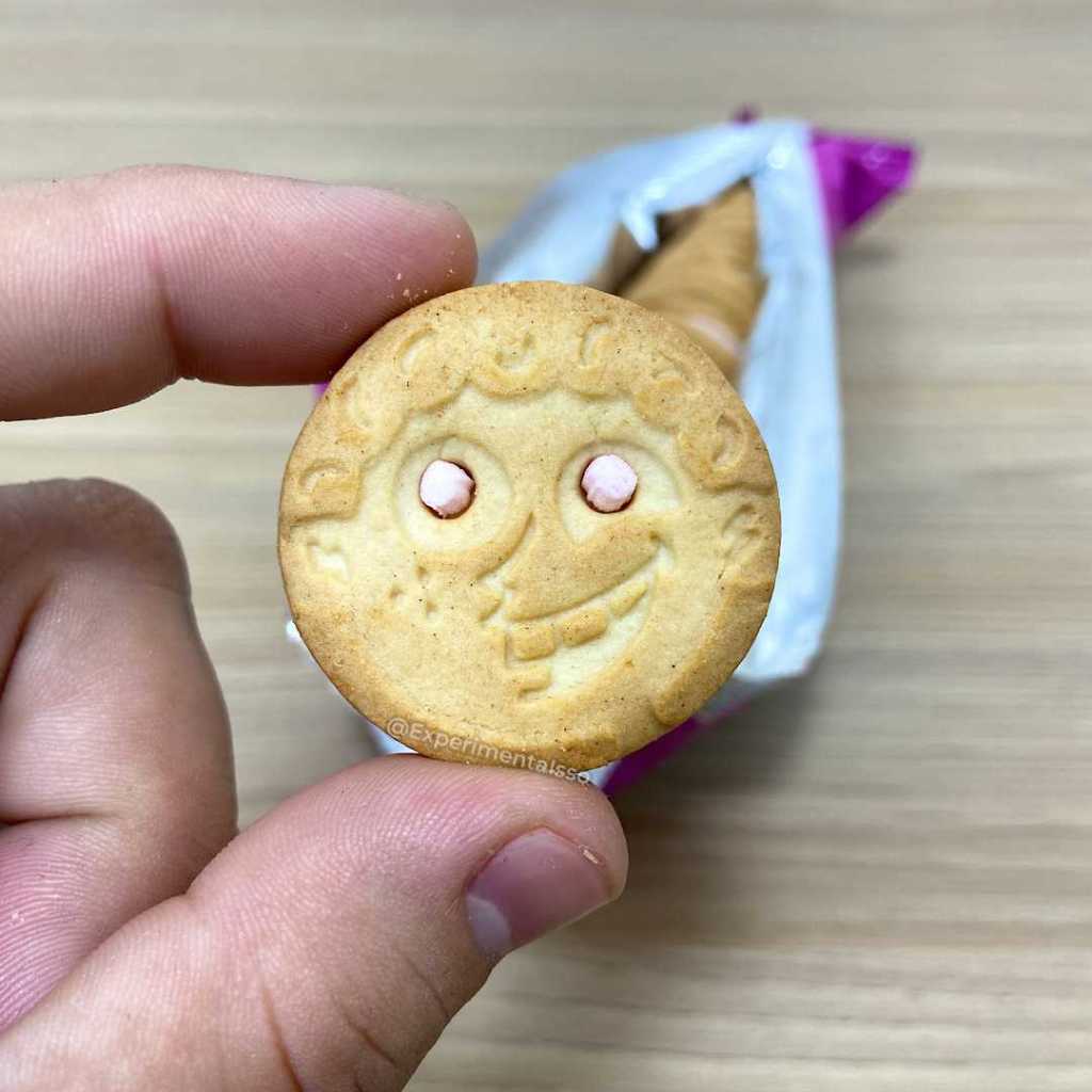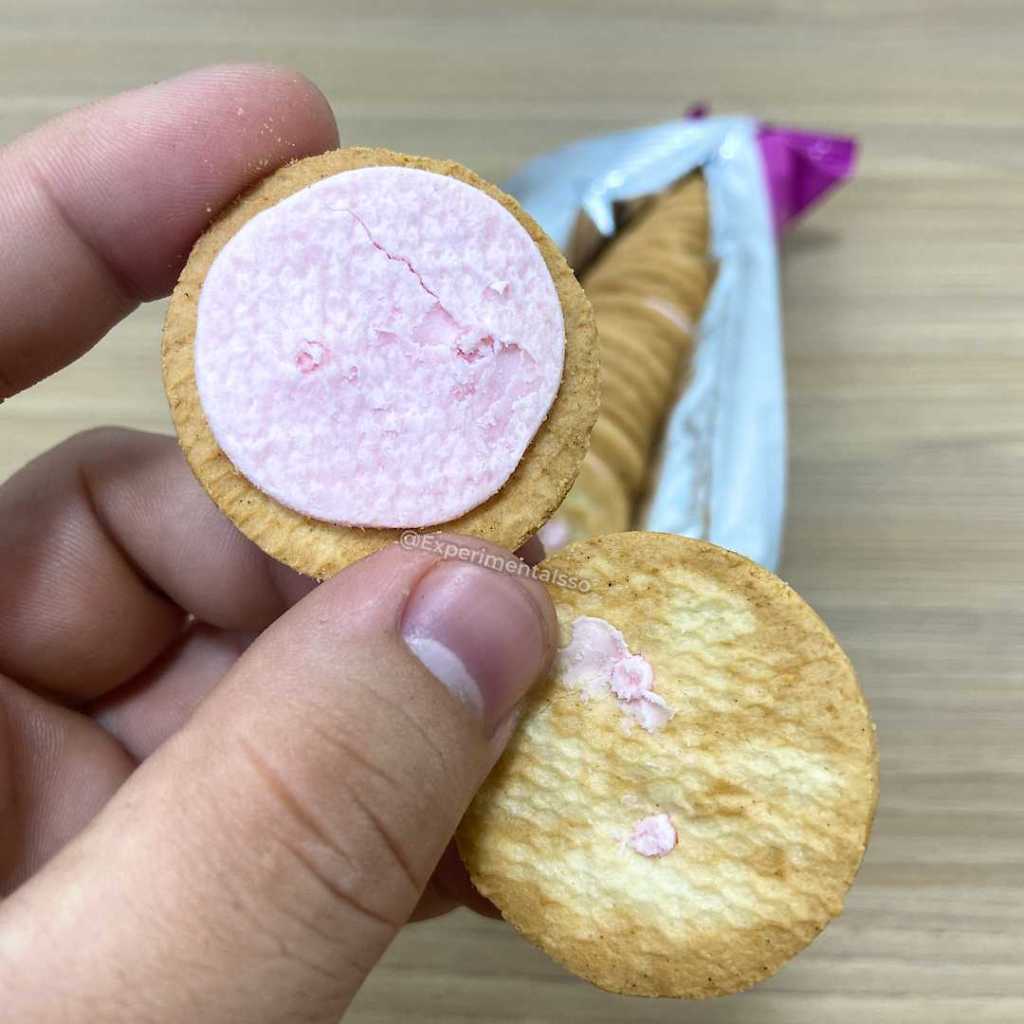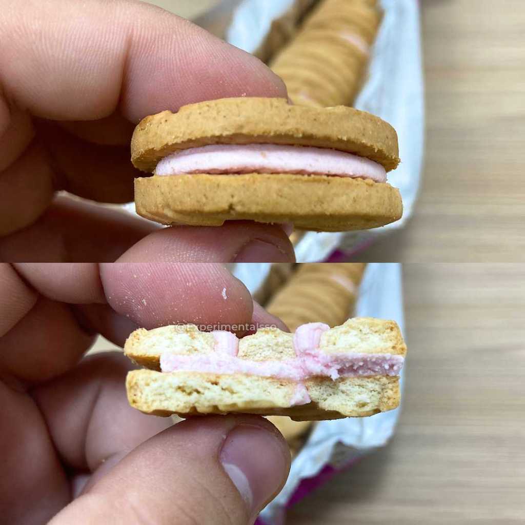 O biscoito de fora é de baunilha e o recheio é sabor Tutti-Frutti. Uma combinação não muito comum no mundo dos biscoitos e bolachas, mas é bom para dar uma variada nos clássico chocolate, creme e morango…E ainda dá pra sentir um gostinho nostálgico como se estivesse experimentando um produto vindo direto dos anos 90…