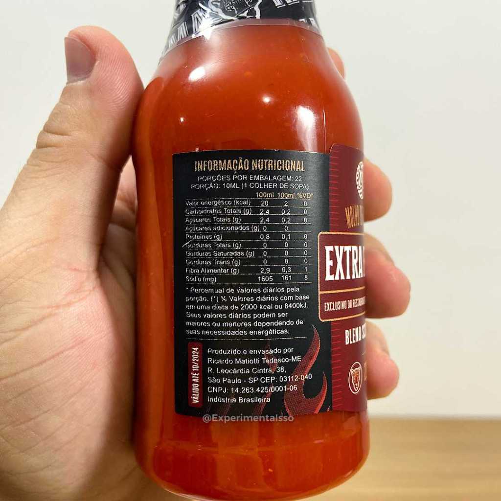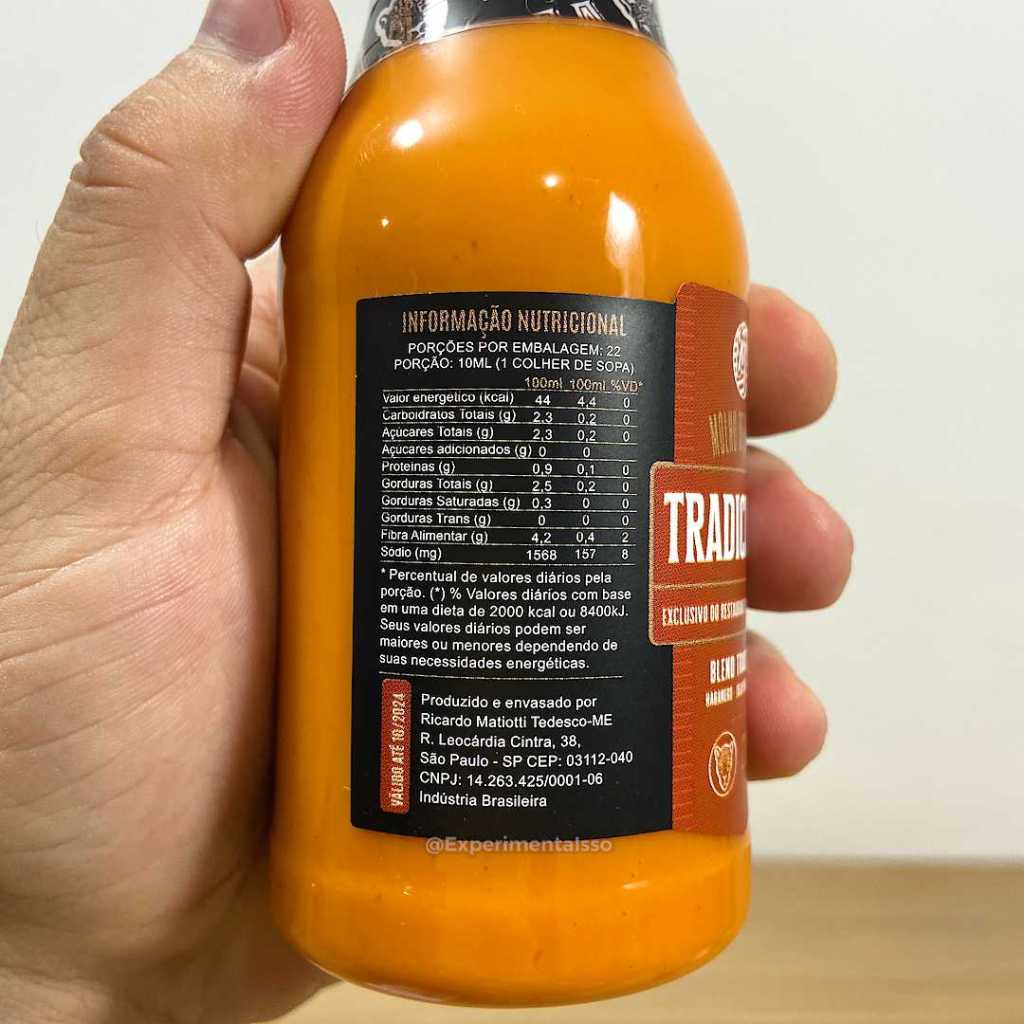 Pimenta tradicional: formada por um blend de jalapeño vermelho combinado à pimenta malagueta e habanero. a composição também tem um toque de azeite de oliva, que confere um sabor caseiro ao molho alaranjado.