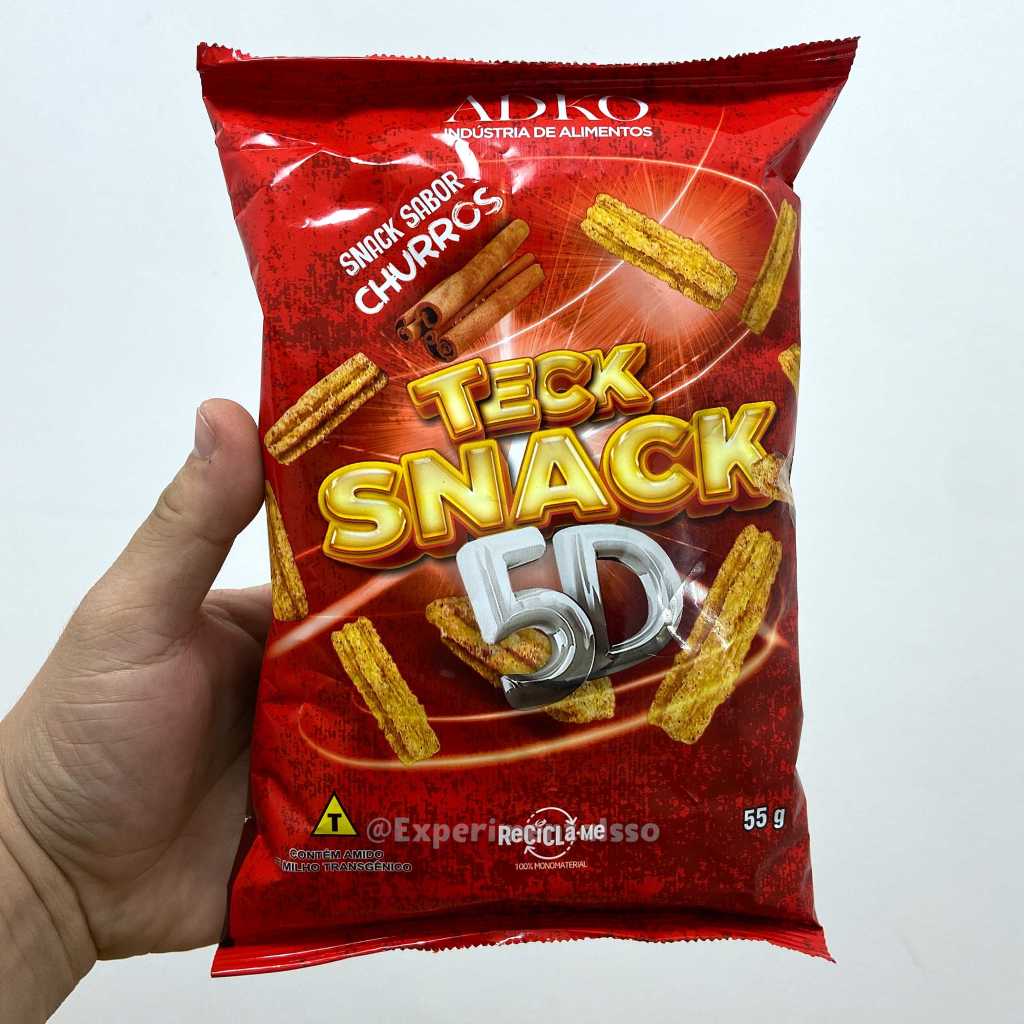 A @adkoalimentos lançou o Teck Snack 5D, uma linha de snacks que conta com 4 sabores: Queijo, Churrasco, Cebola e Salsa e CHURROS!