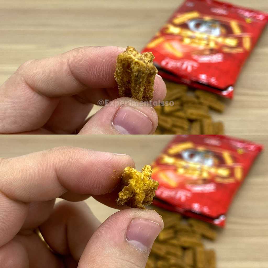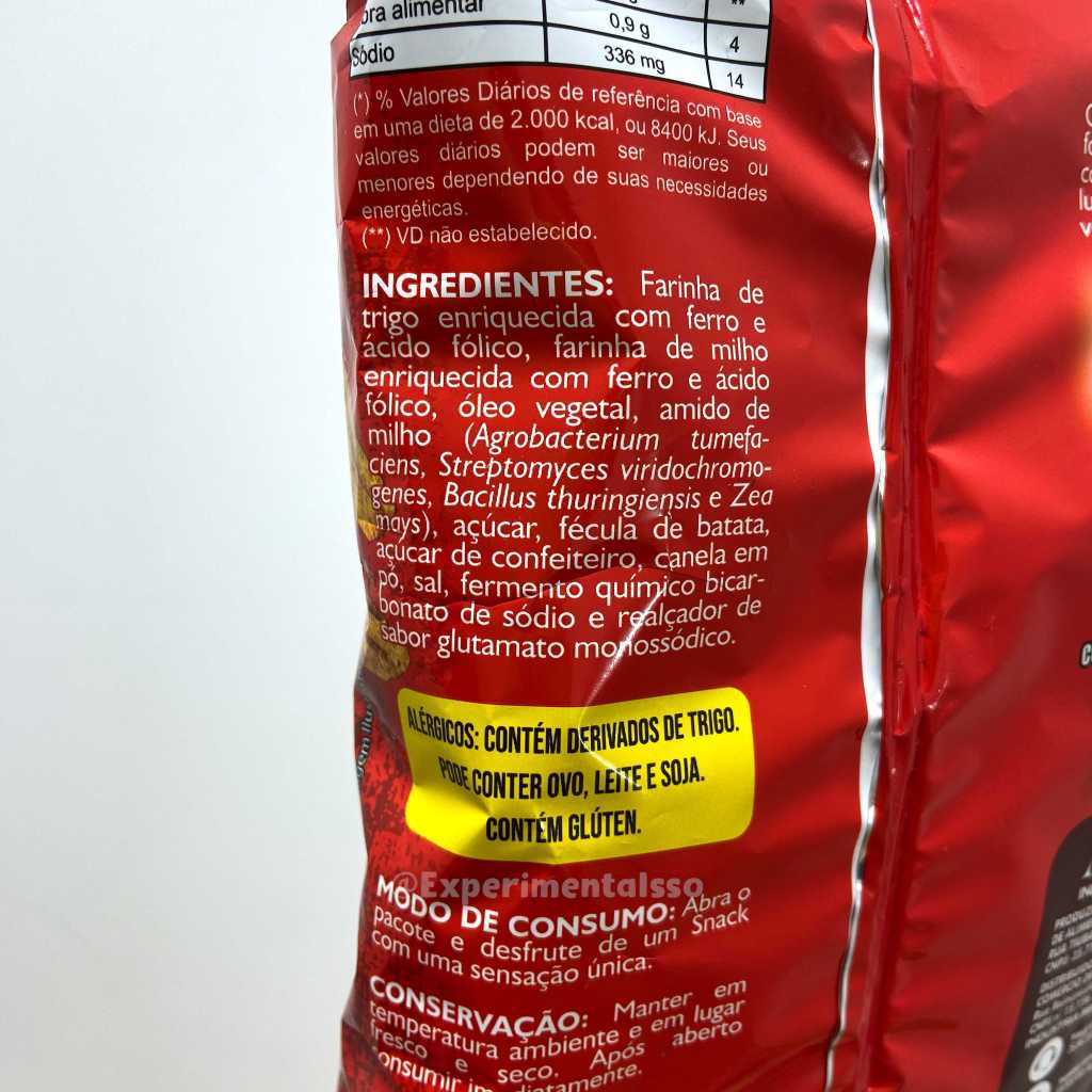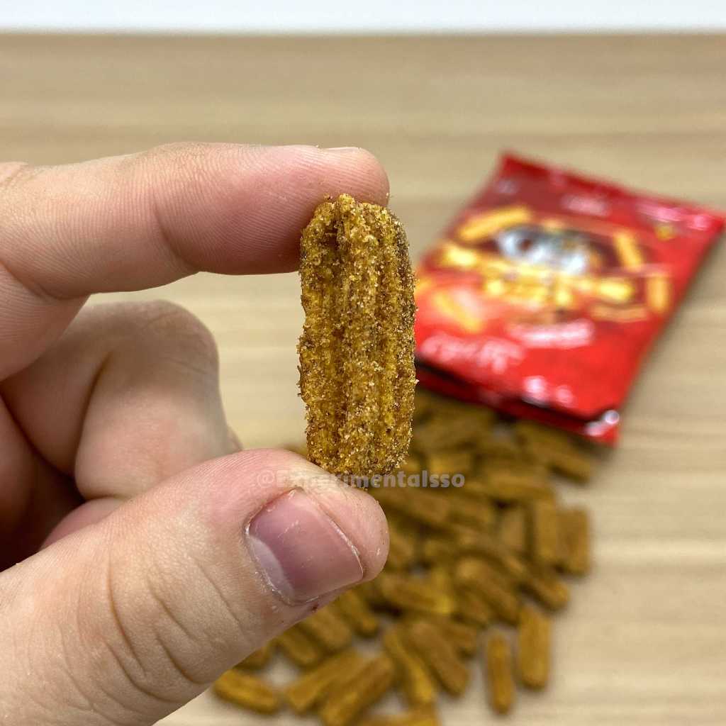 Assim como os outros snacks da linha, o formato diferenciado chama a atenção, nesse caso remetendo ao formato e a textura de um churros tradicional.
