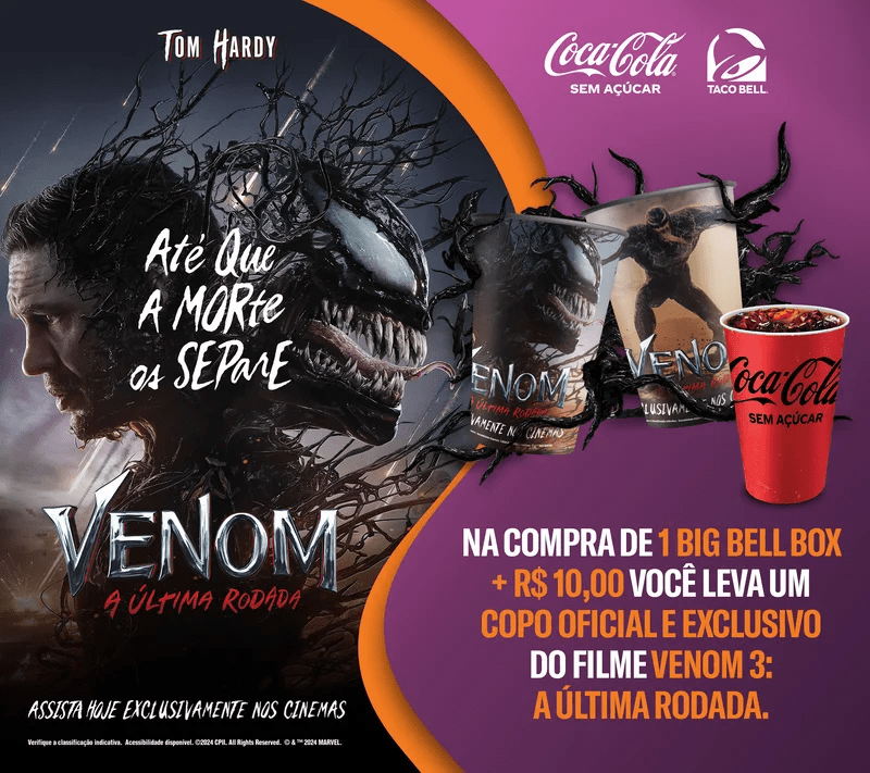 Os fãs do universo Marvel e amantes de fast-food têm um motivo a mais para comemorar! O Taco Bell, em parceria com a Coca-Cola, acaba de lançar uma promoção especial em homenagem ao aguardado filme “Venom: A Última Rodada.” A partir de agora, os clientes que adquirirem uma Big Bell Box em lojas Taco Bell participantes terão a oportunidade de levar para casa um copo personalizado do filme por apenas R$ 10 adicionais. Com o lançamento marcado para 24 de outubro, a promoção promete atrair tanto fãs de cinema quanto consumidores ávidos por novidades.
